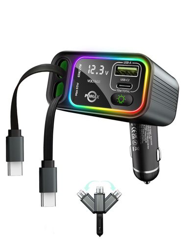 【便利な巻き取り式ケーブル方向調整可能】PDMAXシガーソケット車載充電器USB-A、USB-C、Type-Cケーブルを内蔵し、最大72cmまで伸縮可能です。 巻き取り式のデザインはケーブル収納の悩みを解決します。 ケーブルの収納の手間がかかりません、持ち運ぶ時も邪魔になりません。 巻き取り式充電ケーブル120°方向可能な機能により、ケーブルをどの方向にも向けることができ、デバイスの接続や充電が簡単に行います。 【四台のデバイス同時に充電】PDMAXシガーソケット車載充電器、二つのポート(USBA+USBC)と2本の巻き取り式ケーブル(Type-C+USB-C)で、4台のデバイスの同時充電が可能です。 145Wの強力な出力で、このシガーソケットusb効率的な充電を提供します。 カーチャージャーには2本のType-Cケーブルが内蔵し、単独は最大36Wの電力を出力できる、同時に使用は合計最大72Wの電力を出力可能です。 24V入力時には(一般的にトラックのシガーライターソケットで使用される)、USB-Cケーブルは最大65Wです。 旅行中もすべてのデバイスの電源が確保されます。