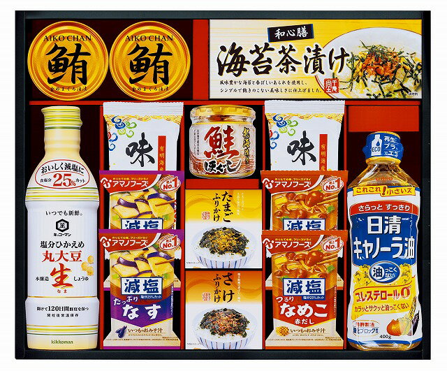 ●セット内容/キッコーマン塩分ひかえめ丸大豆生しょうゆ450ml・日清キャノーラ油400g・アマノフーズ減塩いつものおみそ汁(なす・なめこ)・有明海産味のり(8切5枚)×4・わかめスープ(3.8g×3)・丸美屋ふりかけ(たまご・さけ)2.5g×各3 【卵・乳成分・小麦・えび】●箱サイズ/箱255×390×70mm●賞味期間/360日間●原産国/JPN●重量/1500gおみそ汁や味のりなど、毎日の食卓を彩るバラエティ豊かな詰合せです。