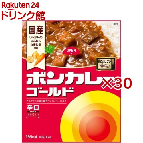 お店TOP>フード>カレー>カレーレトルト>レトルトカレー(辛口)>大塚食品 ボンカレーゴールド 辛口 レンジ調理対応【ボンカレー】 (180g×30セット)【大塚食品 ボンカレーゴールド 辛口 レンジ調理対応【ボンカレー】の商品詳細】●国産のじゃがいも・たまねぎ・にんじんを使用。 ●カルダモンやブラックペッパーなど芳醇スパイスの香り際立つ爽やかなスパイシーカレー●保存料不使用●箱ごと電子レンジ調理対応【召し上がり方】レンジで温める場合1.おもて面のOPENよりフタをあけ、図のようにしっかりと180度折り返してください。 (中袋は箱に入れたまま、封は切らないでください。 )2.フタをしっかりと折り返したまま箱ごとレンジに入れ、表を目安に加熱してください。 中袋がふくらみ、蒸気口から蒸気が抜けます。 3.加熱終了後、レンジから箱を持って取り出してください。 ・加熱時間の目安500W:1分40秒600W:1分30秒700W:1分20秒【お湯でも温められます】中袋の封を切らずに、沸騰したたっぷりのお湯の中で3-5分間温めてください。 ※鍋にはフタをしないでください。 【品名・名称】カレー【大塚食品 ボンカレーゴールド 辛口 レンジ調理対応【ボンカレー】の原材料】野菜(じゃがいも(国産)、にんじん)、ソテーオニオン、牛肉、小麦粉、食用油脂、砂糖、ブイヨン(ビーフ、チキン、ポーク)、食塩、チャツネ、カレー粉、トマトペースト、カレーペースト、りんごペースト、香辛料、脱脂粉乳、ウスターソース、酵母エキス、エシャロットペースト、調味唐辛子/増粘剤(加工デンプン)、調味料(アミノ酸等)、カラメル色素、酸味料、香辛料抽出物、パプリカ色素、香料、リンゴ抽出物、(一部に小麦・乳成分・牛肉・大豆・鶏肉・バナナ・豚肉・りんごを含む)【栄養成分】1人前(180g)当たり(推定値):エネルギー 156kcal、たんぱく質 4.3g、脂質 6.3g、炭水化物 21.5g、糖質 19.3g、食物繊維 2.2g、食塩相当量 2.5g【アレルギー物質】小麦・乳成分・牛肉・大豆・鶏肉・バナナ・豚肉・りんご【保存方法】常温で保存してください。 【注意事項】・ソース中の黒い粒状のものは香辛料です。 ・長時間加熱し続けると蒸気口から中身が吹きこぼれる場合があります。 ・加熱後は蒸気口が開くため、保存できません。 ・中袋が開封しにくいときは、ハサミで開けてください。 業務用レンジ・レンジのオート(自動温め)機能・オーブン・オーブントースター不可マークレンジ取出時・加熱後開封時やけど注意マーク【原産国】日本【ブランド】ボンカレー【発売元、製造元、輸入元又は販売元】大塚食品※説明文は単品の内容です。 商品に関するお電話でのお問合せは、下記までお願いいたします。 受付時間9:00-17:00(土・日・祝日、休業日を除く)食品に関するお問合せ:088-697-0627飲料に関するお問合せ:088-697-0621リニューアルに伴い、パッケージ・内容等予告なく変更する場合がございます。 予めご了承ください。 (ぼんかれーごーるど からくち)・単品JAN:4901150112260大塚食品540-0021 大阪市中央区大手通3丁目2番27号 ※お問合せ番号は商品詳細参照広告文責:楽天グループ株式会社電話:050-5577-5043[インスタント食品/ブランド:ボンカレー/] 大塚食品 ボンカレーゴールド 辛口 レンジ調理対応【ボンカレー】(180g×30セット)【ボンカレー】[レトルト カレー レンジ調理対応 野菜 備蓄] 7,753 ~