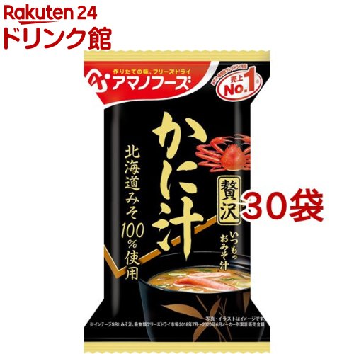 お店TOP>アマノフーズ いつものおみそ汁贅沢 かに汁 (1食入*30袋セット)【アマノフーズ いつものおみそ汁贅沢 かに汁の商品詳細】●かにの身を楽しめる一杯です。 ●癖のない北海道みそときざみ昆布が、かにの旨味を引き立たせています。 【召し上がり方】中身をお椀に入れ、熱湯を約160ml注いで軽くかき混ぜてください。 【品名・名称】即席みそ汁(乾燥タイプ)【アマノフーズ いつものおみそ汁贅沢 かに汁の原材料】米みそ(国内製造)、かに加工品(かに、食塩)、ゆでがに、ねぎ、還元水あめ、風味調味料、こんぶ、でん粉・デキストリン混合物、こんぶ粉末、おきあみエキス調味料、酵母エキスパウダー/調味料(アミノ酸等)、酸化防止剤(ビタミンE)、酸味料、(一部にかに・さば・大豆・魚醤(魚介類)を含む)【栄養成分】1食当たりエネルギー:31kcal、たんぱく質:2.5g、脂質:0.68g、炭水化物:3.7g、食塩相当量:1.7g【アレルギー物質】かに、さば、大豆【保存方法】高温多湿の所を避け、常温で保存してください。 【原産国】日本【ブランド】アマノフーズ【発売元、製造元、輸入元又は販売元】アサヒグループ食品※説明文は単品の内容です。 商品に関するお電話でのお問合せは、下記までお願いいたします。 菓子、食品、健康食品、サプリメント、スキンケアなど:0120-630611ミルク、ベビーフード、乳幼児用品専用:0120-889283リニューアルに伴い、パッケージ・内容等予告なく変更する場合がございます。 予めご了承ください。 ・単品JAN:4971334209727アサヒグループ食品130-8602 東京都墨田区吾妻橋1-23-1 アサヒグループ本社ビル ※お問合せ番号は商品詳細参照広告文責:楽天グループ株式会社電話:050-5306-1825[スープ/ブランド:アマノフーズ/] アマノフーズ いつものおみそ汁贅沢 かに汁(1食入*30袋セット)【アマノフーズ】[みそ汁 フリーズドライ かに インスタント 蟹] 6,621 ~