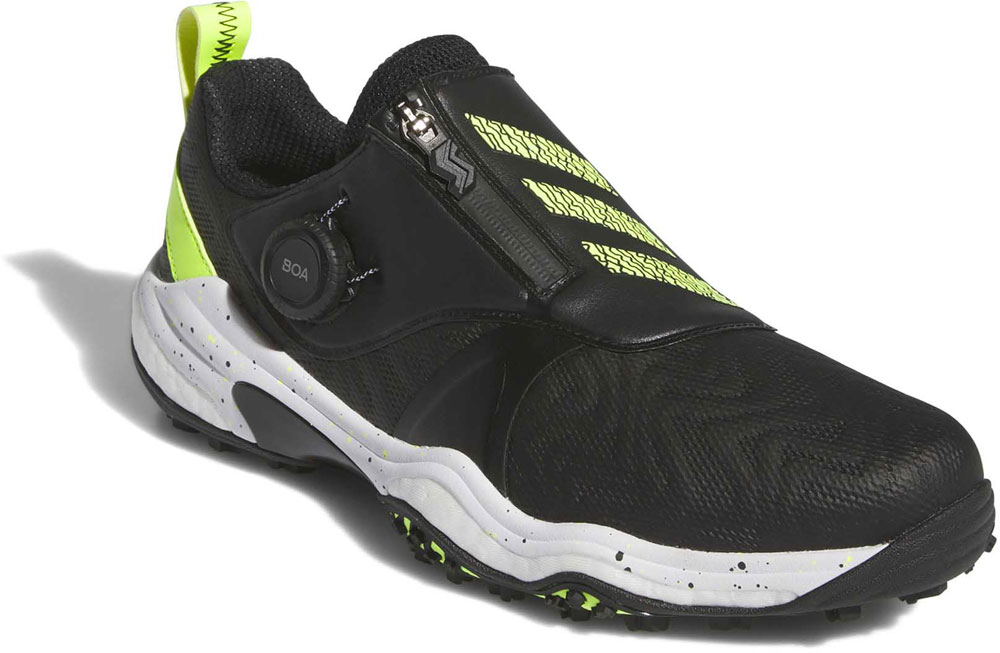 【返品種別A】□「返品種別」について詳しくはこちら□「おひとり様1点まで」2024年07月 発売日本史上でもっとも売れたスパイクレスシューズ、コードカオスシリーズが2年ぶりにフルモデルチェンジ。 ◆adidas最高峰のツアースパイクレスパフォーマンスを追求して開発されたコードカオス25は前作のコードカオス22の性能全てが更にエレベートされている。 最大の特徴は前作から更に約40%も向上したグリップ力。 全く新しい、進化したTWISTGRIPは、前作アウトソールの一部からソール面の100%を覆う構造になり、ラグ(凹凸)の形状・個数・配置の全てを見直し、コードカオス特有の地面と足裏全面が一体化するような特性に加えて地面に鋭く噛み付く様なグリップ要素をプラス。 アディダスゴルフ史上、トップクラスのグリップ性能をスパイクレスで実現。 ミッドソールは、独自の高性能クッショニング素材であるBOOSTとシリーズ初搭載となるLIGHTSTRIKEの2種類ハイブリッドした構造を採用。 従来コードカオスの快適なクッショニングをそのままに、スイング時には前作にないパワフルな反発と安定性の両方をもたらし、メリハリ感の強い性能を実現。 ◆アッパーには新感覚の履き心地と性能を実現する新素材、うどんニットアッパーを採用。 その名の通り、うどんのような形状をしたモチモチとした繊維素材がアッパーの内部にサンドイッチ状に挟まれている構造によって、アッパー内部に一般的なニットより空気を多く含み、枕が内蔵されているかのようなソフトで快適な履き心地をもたらす。 加えて、一定方向には優れた伸縮性がありながら、逆方向には伸びないという特殊な性質によって、前作より歩行時などの動きやすさや快適性がアップしながらも、一定方向には伸びないことでサポート力も同時に向上。 全面的に薄いPUフィルムで覆い、アッパーの伸びの調整をしながら、高い防水性も誇る。 BOAモデルは前作同様、直足BOAラップを採用しつつ、アッパー外部に合成皮革素材のパワーケージでスイング時に最も伸びる箇所を大胆にサポートし安定性が大幅に向上。 ファスナーの開け閉めによる性能差もより顕著に感じられる様に改良。 ファスナー位置もサイドに移動したことで安定性がアップし、止水ファスナーによって防水性も向上。 ■ 仕 様 ■カラー:コアブラック/ルシッドレモン/ホワイト素材・・・ アッパー:合成皮革/合成繊維 ミッドソール:EVA(LIGHTSTRIKE)/合成樹脂(BOOST) アウトソール:合成底重量(25.5cm):約425gツアーパフォーマンスラスト(EE相当)[NKZ93IG8703250]アディダスアウトドア>ゴルフ用品>ゴルフシューズ>メンズ アディダス メンズ スパイクレス ゴルフシューズ コードカオス 25 ボア(コアブラック/ルシッドレモン/ホワイト・サイズ:25.0cm) NKZ93-IG8703-250 adidas 22,000 ~