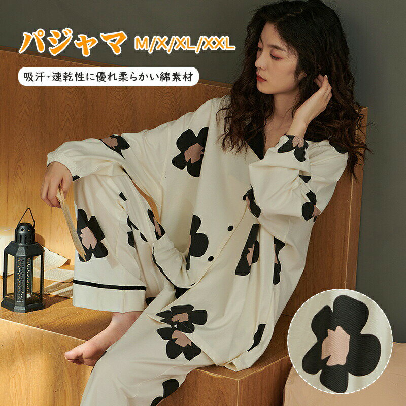 パジャマ ルームウェア レディース 上下セット 長袖 生活 パジャマ 寝巻き オールシーズン 母の日 春秋 秋冬 春夏 春物 大きいサイズ かわいい ゆったり おしゃれ 可愛い 黒白色 花柄 襟付き 長ズボン 大 3,821 ~