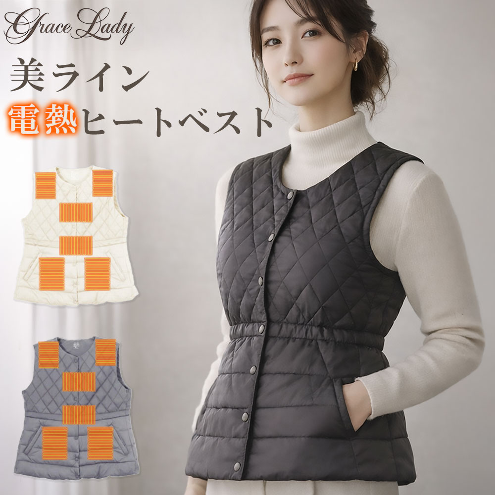 「もこもこで太って見える」はもう卒業。 Grace Lady レディースヒートベスト2025は、 通勤・オフィスでも使えるきれいめデザインと、 しっかり暖かい電熱機能を両立したレディース電熱インナーベストです。 ―――――――――― 【細見えを叶えるデザイン】 ―――――――――― 縦ひし形キルティングを採用し、縦ラインを強調。 ウエストまわりをすっきり見せる細見え設計です。 裾にはドローコード付きで、シルエット調整が可能。 体型やコーデに合わせてウエストを絞ることで、 よりスタイルアップ効果が高まります。 Vネック/ラウンドネック切り替えラインにより、 ジャケットやコートのインナーとして着用しても襟元がもたつきません。 オフィスカジュアルにも自然になじみます。 ―――――――――― 【素材・着心地】 ―――――――――― 表地・裏地ともにナイロン100%、中綿にはポリエステルを使用。 軽量で動きやすく、ヒーターOFF時でもしっかり暖かい設計です。 インナー・アウターどちらにも使いやすい厚みです。 ―――――――――― 【ヒーター仕様・温度調節】 ―――――――――― ヒーター数:6枚 発熱方式:カーボンファイバー発熱体 3段階温度調整(約25~45℃)に対応。 ボタンの色で温度がひと目で分かります。 赤:高温/白:中温/青:低温 ―――――――――― 【電源・使用時間】 ―――――――――― USB Type-A/Type-C 接続に対応。 モバイルバッテリー使用(別売)で、手軽に給電できます。 使用時間目安(10,000mAh使用時) 高温:約3~4時間 中温:約5~6時間 低温:約7~8時間 ※使用環境・バッテリー容量により前後します。 ―――――――――― 【カラー・サイズ】 ―――――――――― カラー:ブラック/ベージュ/グレー サイズ:S・M・L・XL(レディース専用パターン) ―――――――――― 【機能・ディテール】 ―――――――――― ・両サイドポケット付き ・内ポケット(バッテリー収納)搭載 ・ドローコードで冷気の侵入を防止 ・軽量設計でゴワつきにくい着心地 ―――――――――― 【お手入れ・安全性】 ―――――――――― モバイルバッテリーを外せば、手洗いまたは洗濯ネット使用で洗濯機洗い可能(予定)。 ヒーターには折れにくい柔軟素材を使用しています。 通勤・オフィス、普段使い、在宅ワーク、 冬のレジャーやアウトドアまで幅広く活躍する、 レディース向け電熱ヒートベストです。