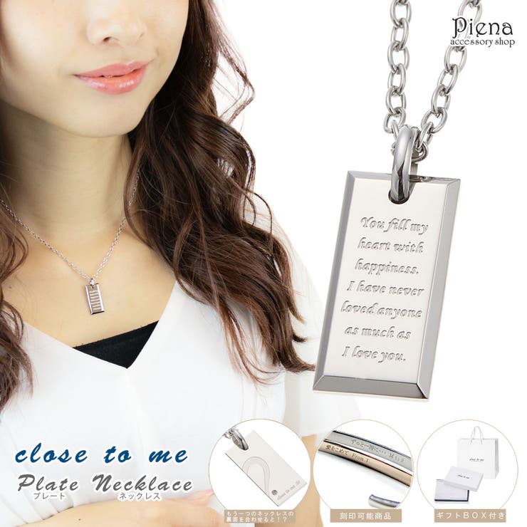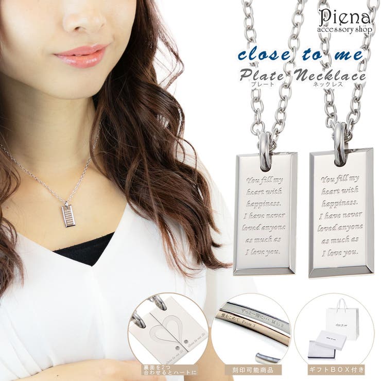 素材サージカルステンレス製キュービックジルコニアサイズトップサイズプレート横:約10.5mmプレート縦:約21.0mmプレート厚み:約1.8mmチェーン全長:50cm(5cmアジャスター含)チェーン太さ:約0.5mm※商品番号「ty-sn11-021」「ty-sn11-022」の2商品を合わせるとハートが現れます。 ※こちらは単品販売のページです。 ペアでは御座いませんのでご了承下さい。 愛のメッセージが入ったプレートの裏面には、2つのトップを並べる事でハートが現れる大切な方と一緒に末永くお使い頂きたいプレートタイプネックレスです。 ハート下にはキュービックジルコニアが一石セットされており、密やかにキラリと輝きを放ちます。 お二人の大切な記念に、心を込めた思いでに残るプレゼントを。 素材は医療用工具のメスやハサミにも使用されているサージカルステンレスを使用していますので、金属アレルギーの方でも比較的安心してご使用頂けます(全ての方に金属アレルギーが出ない事を保障する物ではございません)こちらの商品は「専用プレゼントボックス付き」です。 そのままプレゼント出来る専用のBOXと紙袋が付属してますので、誕生日プレゼント、クリスマスプレゼントなどに最適です。 返品・交換について購入後の交換は受け付けておりません。 予めご了承ください。 返品を希望される場合は購入履歴一覧の「ショップへの問い合わせ」よりお問い合わせください。 =========================複数配送先指定について1件の注文に対して、異なる住所への配送は対応出来かねます。 恐れ入りますが、異なる住所へ配送をご希望の場合、配送先毎に分けて注文いただきますようお願い申し上げます。 【アクセサリーWOMEN】 【10%OFFクーポン!1/16(金)1:59まで】アクセサリーショップPIENA ネックレス レディース メンズ サージカルステンレス Close to me プレート 愛のメッセージ アジャスター付き 長さ調節可能お肌に優しい 金属アレルギー対応 お 8,800 ~