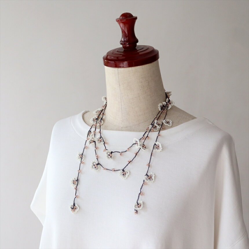 タグ:#同じ形色違い⇒レース編みのオヤトルコのレース編「オヤ」ネックレス 5房の葡萄と華やかなフラワー シルバーグレー/ブラック品 番ac2259サイズ長さ約40cm モチーフの大きさ 2.5-3.0cm材 質ナイロン糸・ビーズ制 作トルコ・イスタンブール「オヤ(OYA)」とは花などを模したトルコの伝統的レース編み編みの装飾のことで、古くからアナトリア・エーゲ海地方の女性のスカーフ飾りとして親しまれてきました。 かぎ針を使って編み上げたモチーフを、トゥ・オヤ、本品のようなビーズを編み込んだものをボンジュック・オヤといいます。 このネックレスは、イスタンブールのデザイナーが、スカーフ飾りをアレンジしたもので、フリルのように見えるひとつひとつがフラワーモチーフです。 ビーズとのコンビネーションが美しいハンドメイドアクセサリーです。 トルコレースオヤ, 手芸, トゥオヤ, ネックレス, 天然石, アクセサリ, 手編みレース, 伝統工芸, レースネックレス, レースアクセサリー, 手仕事, ハンドメイド, フラワーモチーフ, 一点もの, Turkish Oya, Handmade, tug Oya 【10%OFFクーポン対象】トルコのレース編「オヤ」ネックレス 5房の葡萄と華やかなフラワー シルバーグレー/ブラック 11,000 ~