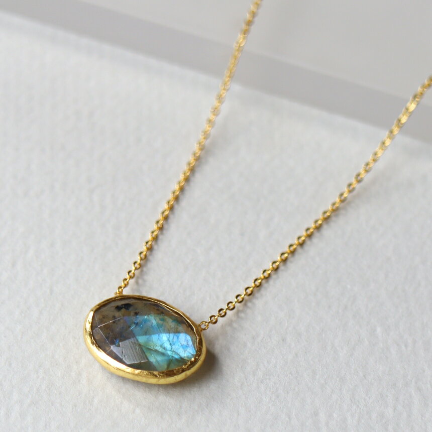 極上ラブラドライトのブリオレットマロンカットネックレス ?Delfina14KGF ラブラドライト 天然石 ジュエリー プレゼント 母の日 ネックレス シンプル ハンドメイド 透明感が美しいグレーの地の色のストーンに、ドキッとするようなシラー(遊色効果)を見せるラブラドライト。 月の光や天体、虹、蝶の羽などに例えられる、美しい表情です。 Delfina/デルフィーナ【 Tone 】 - Series運命、を意味する石。 なんという神秘的な光でしょう。 見る角度によって色彩を変える美しい光(ラブラドレッセンス)を持つのが特徴のラブラドライトの、ブルーのラブラドレッセンスを持つものを厳選して選別しました。 表面に美しく色味が現れ、かつ原石そのものの透明度も十分に高いものを選び抜いてお仕立てしております。 オーロラ、アゲハ蝶の羽根、虹などに例えられる、奇跡的な輝きです。 青みにも緑?青~青紫とニュアンスがありますが、石はお選びいただけません。 美しく輝くものをこちらで選別いたしますのでどうぞお任せください。 ラブラドライト鉱石の特徴として、縞になったクラックや黒ポツがございます。 撮影しておりますので合わせてご確認くださりお取引ください。 14KGF 40cm石 約8mm■ラブラドライトについて石言葉月と太陽の象徴、魂、インスピレーション、自分に合うものを引き寄せるラブラドル長石は、曹灰長石(そうかいちょうせき)とも呼ばれる斜長石の一種。 光をあてるとイリデッセンスという特有の虹色の輝きを示します。 この現象は遊色効果であり、ラブラドル長石のものは特にラブラドル効果、又はラブラドレッセンスとも呼ばれます。 ※ラブラドライトのシラーの様子(青色のニュアンスなど)はお任せください。 多くの石の中から、青いシラーの強いものを厳選してお送りしています。 ※ラブラドライトは層状に結晶しているため、研磨した状態ではヒビ(結晶層)が目立ちやすい特性があります。 これは石の構造によるもので、不良品などではありません。 あらかじめご了承下さい。 5 極上ラブラドライトのブリオレットマロンカットネックレス ?Delfina14KGF ラブラドライト 天然石 ジュエリー プレゼント 母の日 ネックレス シンプル ハンドメイド 9,100 ~