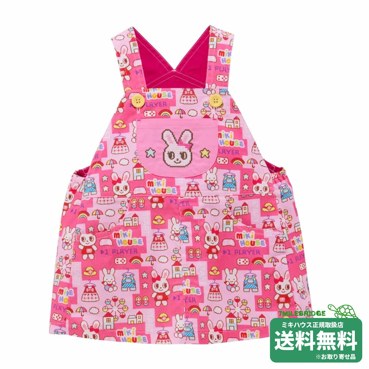 商品について レトロゲームの世界観を総柄であしらったジャンパースカートです。 インパクト抜群でみんなの注目を集めること間違いなし! うさこが着せ替えゲームのキャラクターになったようなデザインは見ているだけでワクワクして、 お着替えもきっと楽しくなります。 ・ポケット:あり(胸元、前両サイド、後ろ右側) ・肩紐は二段階で調節可能 >>このカテゴリの商品を見る \★セール商品はこちら★/ 素材 コーマツイルプリント 品質 綿 100% 生産国 日本 サイズについて 【S(70-80)】身幅30.5、着丈43 【M(80-90)】身幅32、着丈48.5 【L(90-100)】身幅33.5、着丈54.5 【LL(100-110)】身幅35、着丈59.5 ※単位は(cm)です。 ※表示寸法は目安となっております。 実際の商品の寸法とは若干の誤差がある場合がございます。 ラッピングについて 簡易有料ラッピング、有料ラッピング、無料ラッピングの3種類ございます。 【簡易有料ラッピング】 薄手のお洋服なら1?2枚、小物1点程度の容量まで。 ナイロン製ショッパー1枚つき。 熨斗、メッセージカード不可。 【有料ラッピング】 ギフトボックス(一部商品除く)、ショッパーつき。 熨斗、メッセージカードOK。 以下ページよりご購入下さい。 【無料ラッピング】 無料ラッピングをご希望の場合は、 ご注文時の備考欄にてお申しつけください。 ※熨斗不可 ※メッセージカード不可 ・お洋服や服飾小物の場合 お値札を外し、透明ビニールに商品を入れ替え リボンシールを貼るのみの対応となります。 ショップ袋はつきません。 ・シューズ(箱付き)の場合 お値札を外し、箱を包装紙でお包みして リボンシールを貼るのみの対応となります。 箱無しタイプは、透明ビニール袋となります。 ショップ袋はつきません。 ・ショップ袋ご希望の場合 ショップ袋は以下内容にて有料でのご用意となります。 ご希望の場合は、ご注文時の備考欄にてお申しつけください。 ご注文確認後に、ご請求の加算修正をさせて頂きます。 ミキハウス紙袋タイプ ショップ袋 1枚110円(税込) ミキハウスビニールタイプ ショップ袋 1枚55円(税込) 商品在庫についてのご注意 こちらの商品はお取り寄せのため、ご注文いただきましても入荷元在庫都合により、 商品がご用意できない場合もございます。 予めご了承下さい。