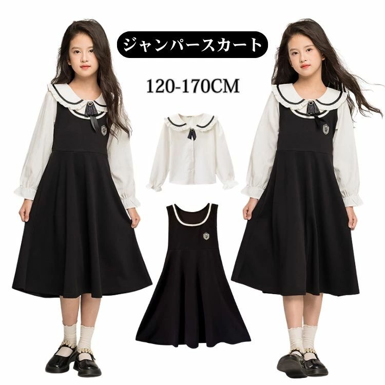 【2点セット】キッズ ジャンパースカート トップス ブラウス 女の子 子供服 セットアップ ジュニア 長袖 フォーマル ワンピース ブラック フリル襟 制服風 重ね着 受験 ロング丈 入学式 学校説明会 発表会 幼稚園 小学校 受験 スーツ ワンピース 120 130 140 150 160 170 5,108 ~
