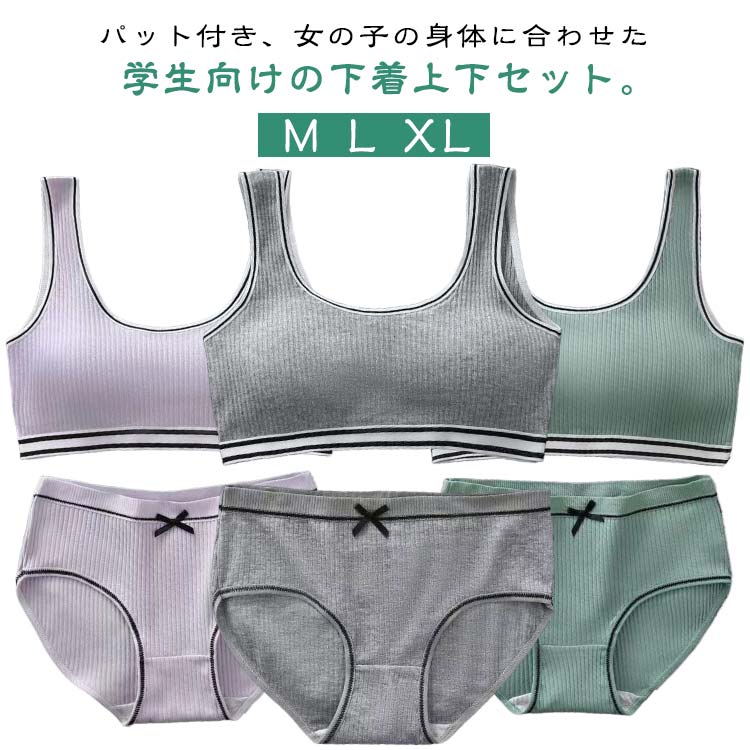 パット付き、女の子の身体に合わせた学生向けの下着上下セット柔らかく通気性抜群の素材を採用して汗をかいても吸収して乾きやすい、蒸れずにさらっとした快適な着心地が続きます。 安心のベスト仕様は肩が動かしやすいでずれ落ちない。 取り外し可能のパッド付き、いつでも清潔にお使いいただけます。 シンプルなデザインでスッキリしたシルエットを演出してトップスに響かないから嬉しい。 サイズ 上下セット サイズについての説明 適応体重30-50kg 素材 ポリエステル 色 黒 灰 ピンク 濃い緑 紫 肌 浅い緑 白 備考 ●サイズ詳細等の測り方はスタッフ間で統一、徹底はしておりますが、実寸は商品によって若干の誤差(1cm〜3cm )がある場合がございますので、予めご了承ください。 ●商品の色は、撮影時の光や、お客様のモニターの色具合などにより、実際の商品と異なる場合がございます。 あらかじめ、ご了承ください。 ●製品によっては、生地の特性上、洗濯時に縮む場合がございますので洗濯時はご注意下さいませ。 ▼色味の強い製品によっては他の衣類などに色移りする場合もございますので、速やかに(脱水、乾燥等)するようにお願いいたします。 ▼生地によっては摩擦や汗、雨などで濡れた時は、他の製品に移染する恐れがございますので、着用の際はご注意下さい。 ▼生地の特性上、やや匂いが強く感じられるものもございます。 数日のご使用や陰干しなどで気になる匂いはほとんど感じられなくなります。