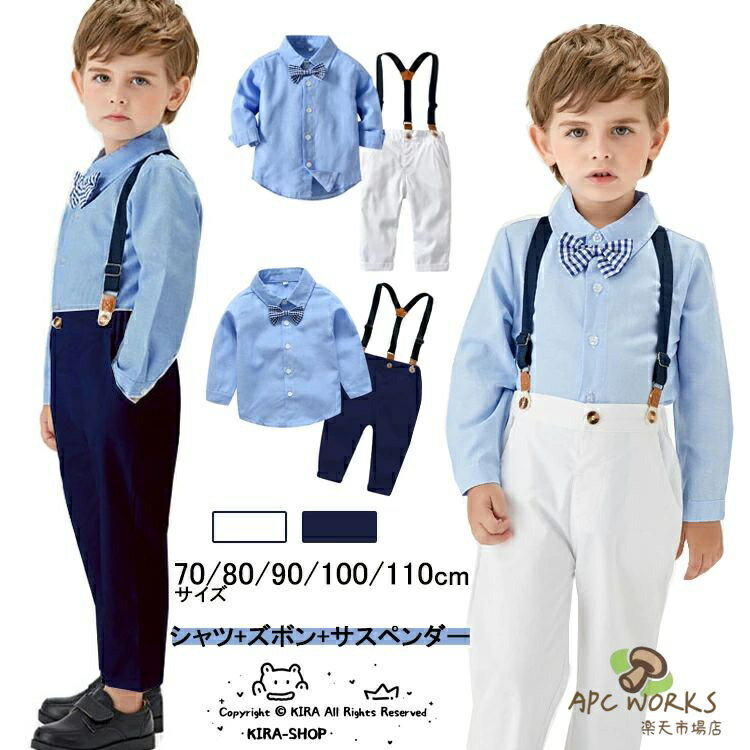 大人顔負けデザインの子供服! かっこいい男の子に♪パパ ママ おじいちゃん おばあちゃんもメロメロ♪しっかりしていて且つ肌触りのよい上質な生地を使用していますので、子供も快適におしゃれできます。 サイズ展開は赤ちゃんからお兄さんまで。 兄弟や、お友達とお揃いも素敵ですね♪ 商品説明商品名男の子 フォーマル スーツ 上下セット 素材棉 生産国中国サイズ 【70】身長60-70cm 着丈39cm ズボン丈41cm 肩幅24cm 袖丈26cm ウエスト18cm 【80】身長70-80cm 着丈41cm ズボン丈44cm 肩幅24cm 袖丈28.5cm ウエスト22cm 【90】身長80-90cm 着丈44cm ズボン丈47cm 肩幅25cm 袖丈30.5cm ウエスト23cm 【100】身長90-100cm 着丈47cm ズボン丈50cm 肩幅25cm 袖丈32cm ウエスト24cm 【110】身長100-110cm 着丈50cm ズボン丈53cm 肩幅27cm 袖丈34cm ウエスト24.5cm セット内容 シャツ パンツ サスペンダー 蝶ネクタイ(縫い付けタイプ) 注意 PC環境・光の具合により、色や素材のイメージが写真と若干異なる場合がございます。 モデル・写真に使用されているアクセサリー・小物は別途記載が無い限り付属いたしません。 商品に不良があった場合は、商品到着から5日以内にご連絡いただければご返金・交換対応させて頂きます。 商品のサイズは、全て平置きにて外寸を測定しております。 商品によっては+-0.5cm〜1cmの誤差が発生してしまう場合がございます。 該当商品は他店と在庫共有です。 タイミングにより、在庫ズレが生じる場合がございます。 予めご了承ください。