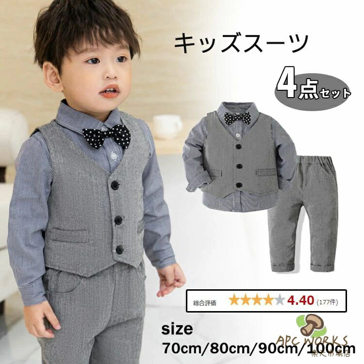 商品説明商品名 ズボンはベストと共通の生地を使っています。 フォーマルにもおでかけにもOK!綿なのでベビー・キッズのお肌にも安心! お子様の晴れ舞台に大活躍間違いなしの男の子スーツ! 出産祝い、記念日、イベント、誕生日、撮影写真、パーティー、普段着、入園式、部屋着にぴったりです。 素材棉 +ポリエステル生産国中国サイズ 【70cm】 上着丈31cm 肩幅23cm 袖丈29cm 下着丈42cm 【80cm】 上着丈33cm 肩幅24cm 袖丈31cm 下着丈46cm 【90cm】 上着丈35cm 肩幅25cm 袖丈34cm 下着丈50cm 【100cm】上着丈37cm 肩幅27cm 袖丈35cm 下着丈54cm セット内容 ベスト シャツ ズボン 蝶ネクタイ(取り外し可能) 注意 PC環境・光の具合により、色や素材のイメージが写真と若干異なる場合がございます。 モデル・写真に使用されているアクセサリー・小物は別途記載が無い限り付属いたしません。 商品に不良があった場合は、商品到着から5日以内にご連絡いただければご返金・交換対応させて頂きます。 商品のサイズは、全て平置きにて外寸を測定しております。 商品によっては+-0.5cm〜1cmの誤差が発生してしまう場合がございます。 該当商品は他店と在庫共有です。 タイミングにより、在庫ズレが生じる場合がございます。 予めご了承ください。