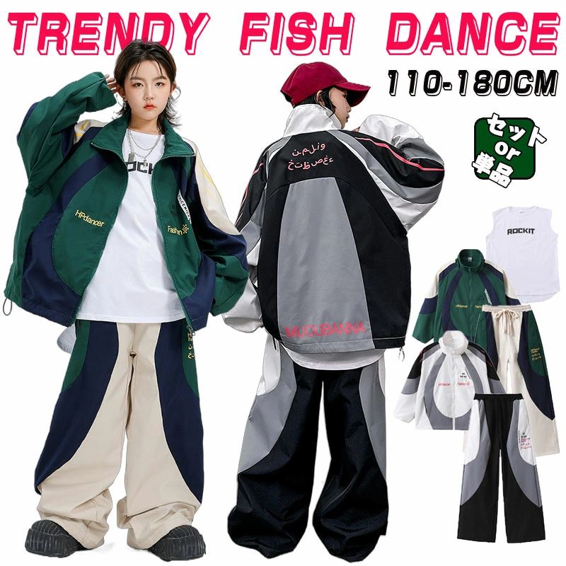 ウィンドブレーカー ジャケット パンツ 上下 セット 男女兼用 子供服 キッズダンス衣装 セットアップ 長袖 緑 白灰黒 タンクトップ 白 ヒップホップ 衣装 キッズ ダンス 衣装 練習着 キッズ カーゴパンツ トレーナー スポーツウェア セット ストリート 切替 練習着 2,549 ~