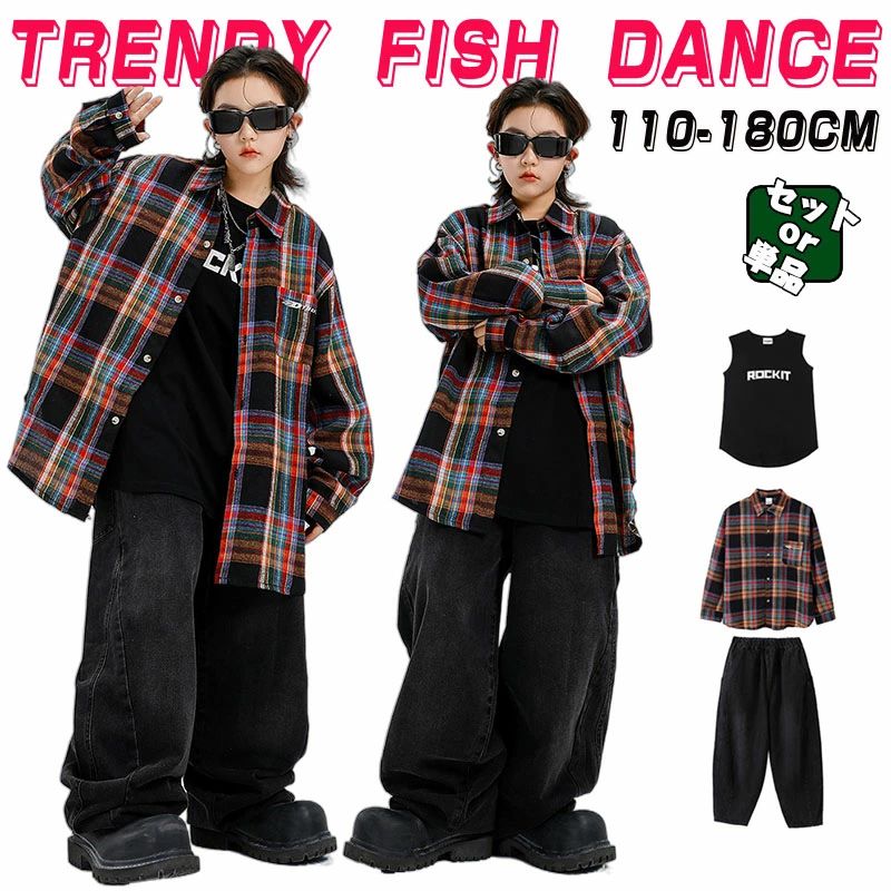 ジーパン チェック柄 シャツ ヒップホップ キッズ ダンス衣装 デニム パンツ 男女 長袖トップス 黒 タンクトップ ロングパンツ 韓国 セットアップ 子供服 女の子 男の子 ストリート レッスン着 チアガールズ b系 子ども服 カッコイイ ダンスウェア hiphop 演出服 110-180cm 2,549 ~