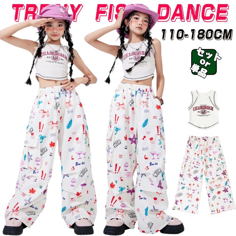 ホワイト 女の子 ダンス衣装 キッズ 単品 セットアップ へそ出し タンクトップ ロングパンツ ワイドパンツ ダボパンツ 総柄 練習着 レッスン着 ステージ衣装 韓国 カッコイイ ダンスウエア ヒップホップ チアガール チアリーダー 演出服 舞台服 発表会 イベント 2,549 ~