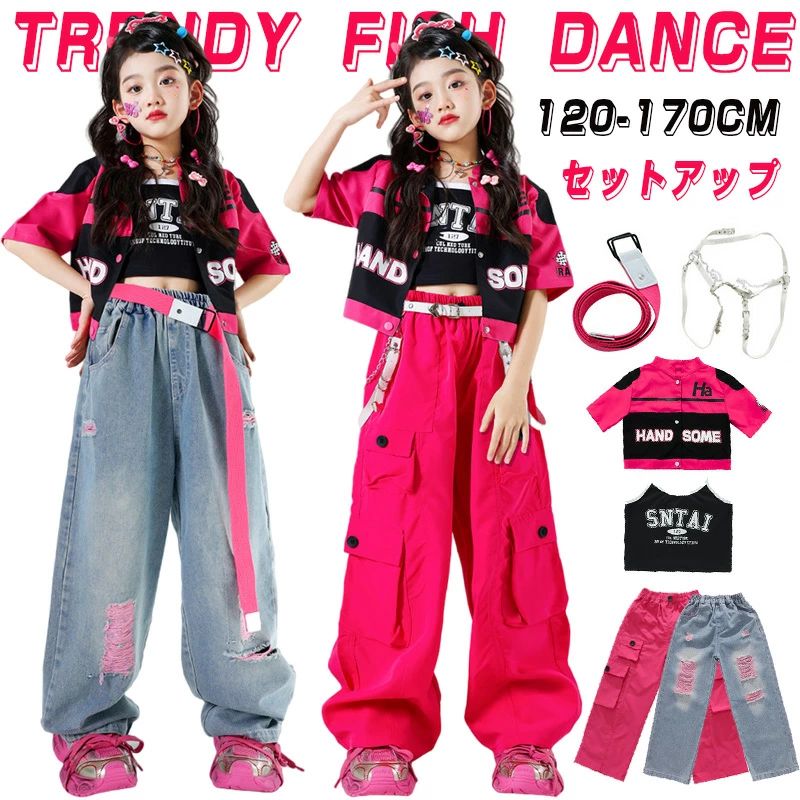 レーシングスーツ デニム ローズ 女の子 ダンス衣装 セットアップ キッズ へそ出し 半袖 シャツ タンクトップ デニムパンツ ジーンズ カーゴパンツ ワイドパンツ ストレート ジャズダンス ヒップホップ ポッピング チアガール 団体服 発表会 演出服 応援団 原宿系 6,653 ~