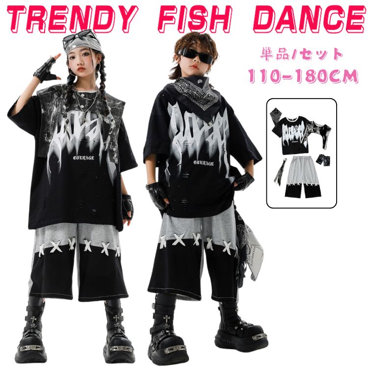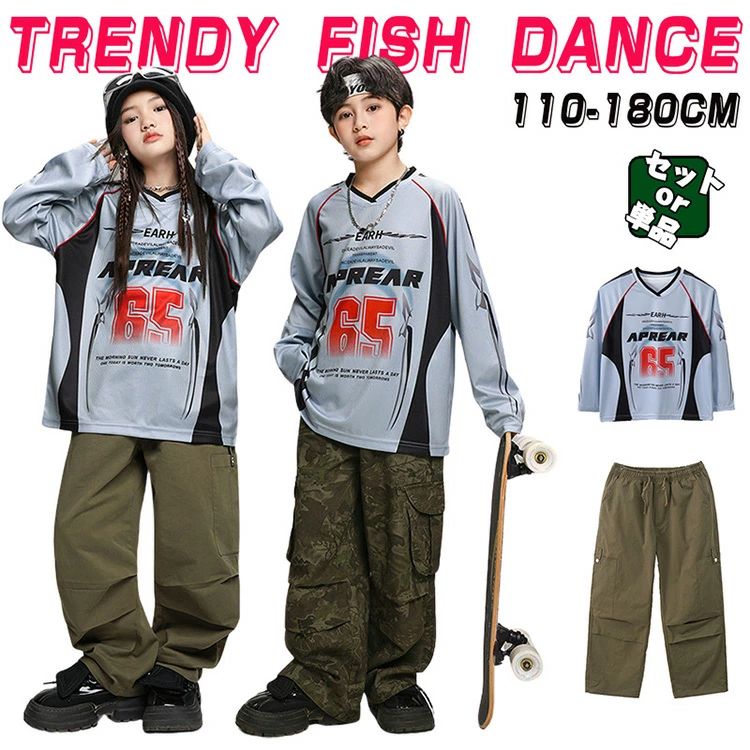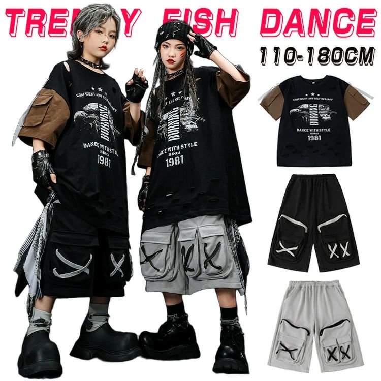 キッズ ダンス衣装 セットアップ 男の子 女の子 へそ出し 半袖 シャツ アームカバー付き カーゴパンツ 迷彩パンツ ブラック ダボダボ 練習着 レッスン着 習い服 カッコイイ ダンスウエア ステージ衣装 ジャズダンス 韓国k-pop jazz 舞台服 演出服 発表会 運動会 4,568 ~