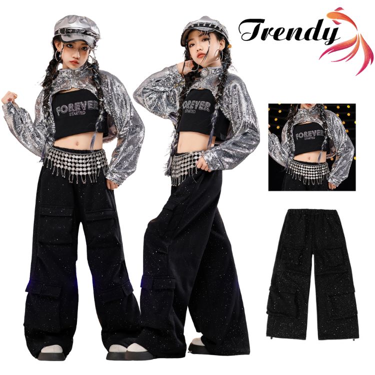 光沢 銀色 黒 シルバー トップス キャミソール 長パンツ スパンコール へそ出し キッズ ダンス セットアップ 韓国 k-pop ヒップホップ 女の子 ギャル アイドル かっこいい カジュアル 子供服 きらきら ステージ衣装 jazz ジャズダンス 団体服 練習着 演出服 原宿系 110-180cm 4,450 ~