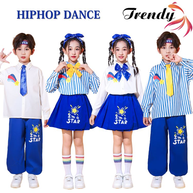 青色 白 ブルー ホワイト ボーダー柄 縦縞 星柄 トップス シャツ パンツ スカート キッズ ダンス セットアップ 韓国 k-pop ヒップホップ 男の子 女の子 ギャル アイドル かっこいい ゆったり 子供服 ステージ衣装 jazz ジャズダンス 団体服 練習着 演出服 原宿系 110-180cm 4,450 ~