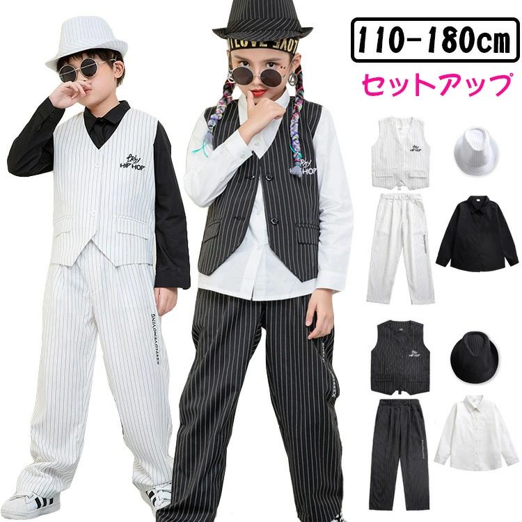黒色 白 ストライプ柄 キッズ ダンス衣装 セットアップ ヒップホップ セットアップ HIPHOP ロック ダンス衣装 男の子 女の子 ベスト パンツ スーツ風 Popping locking 舞台 ステージ衣装 キッズダンス衣装 スーツ ベスト パンツ スラックス ホワイト ブラック 4,450 ~