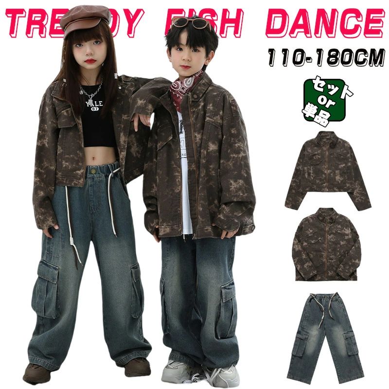 キッズ ダンス衣装 単品 セットアップ 女の子 男の子 へそ出し 長袖 迷彩 ジャケット ジップアップ デニムパンツ ロング丈 ブラウン ブルー ストリート カッコイイ ダンスウエア ステージ衣装 ジャズダンス 韓国k-pop jazz 舞台服 演出服 発表会 運動会 4,568 ~