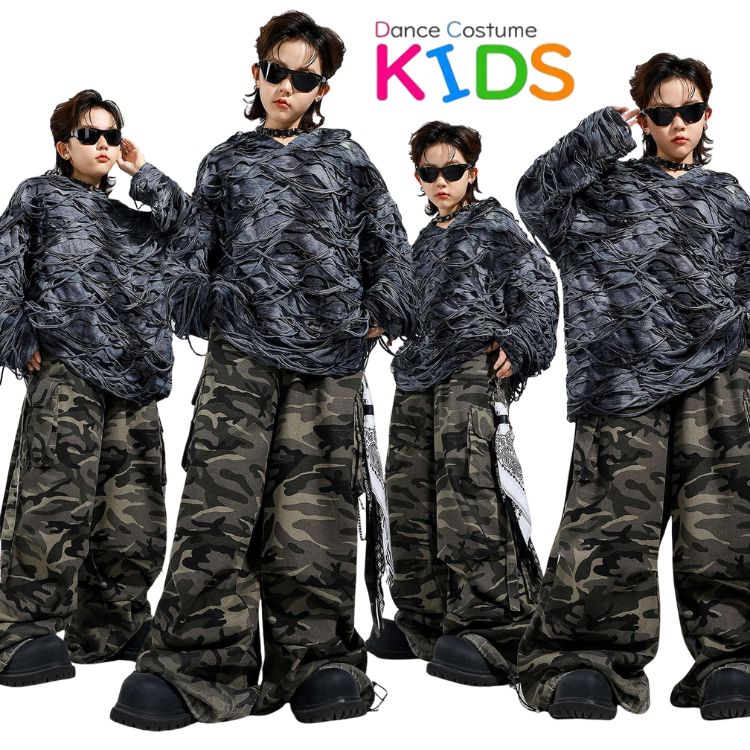 グレー 灰色 トップス パーカー 漁網目 ニット 長パンツ 迷彩パンツ 迷彩柄 キッズ ダンス セットアップ 韓国 k-pop ヒップホップ 男の子 アイドル かっこいい カジュアル 子供服 ステージ衣装 jazz ジャズダンス 団体服 練習着 演出服 原宿系 110-180cm 4,212 ~