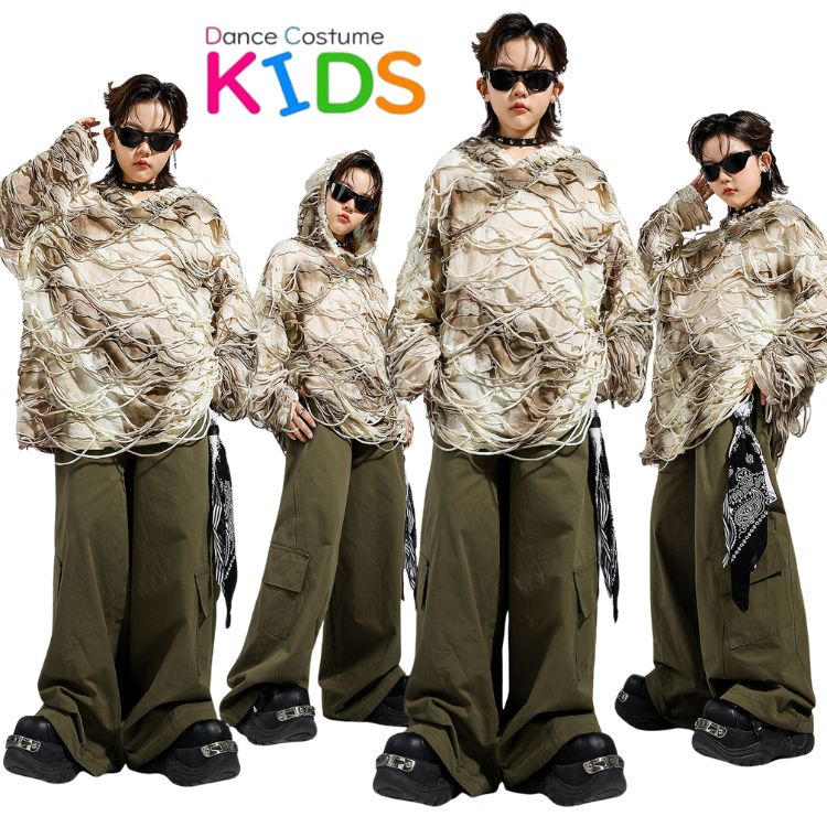 カーキ ベージュ トップス 漁網目 ニット 長パンツ カーゴパンツ キッズ ダンス セットアップ 韓国 k-pop ヒップホップ 男の子 アイドル かっこいい カジュアル 子供服 ステージ衣装 jazz ジャズダンス 団体服 練習着 演出服 原宿系 110-180cm 4,212 ~