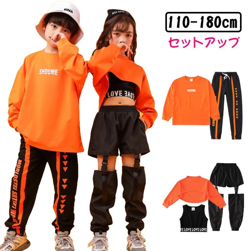 オレンジ キッズ ダンス衣装 ステージ服 ヒップホップ セットアップ 長袖 トレーナー へそ出し パーカー シャツ ロングパンツ 男の子 女の子 タンクトップ ダンスウェア hiphop オレンジ ブラック 子ども 子供 チア チアガール 演出服 練習着 団体服 応援団 個性派 幼稚園 4,212 ~