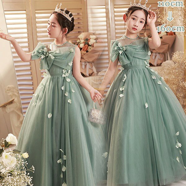 ピアノ発表会 ドレス 中学生 ワンピース ジュニアドレス 七五三 子供ドレス 後ろに大きいリボン グリーン ノースリーブ ロング丈 上品 ワンピース お姫様 グリーン バイオリン ピアノコンクール 披露宴 上品 エレガント 女の子 結婚式 フォーマル用 キッズドレス 16,980 ~