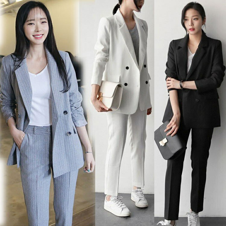 全4色 カジュアルスーツ ダブル ストライプ パンツスーツ女性 事務服 OL 通勤 韓国ファッション パンツスーツ 就職 活動 面接 転職2点セット 6,255 ~