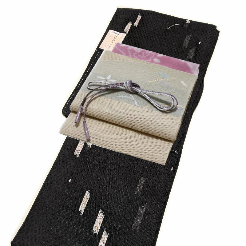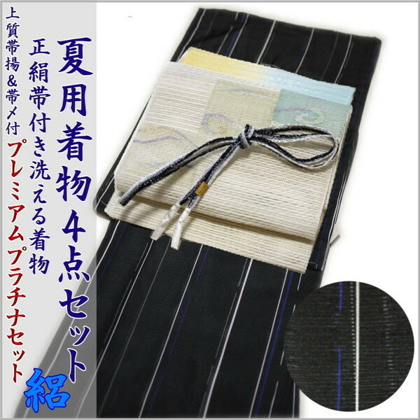 とっても素敵な夏用の着物4点セットです。 (着物・帯・帯揚げ・帯締め) 着物は画像の商品となります。 帯は必ず正絹帯をお届けいたします。 帯・帯揚げ・帯締めは御召になる方の年代とご希望のイメージに合わせて当店でコーディネートしてお届けいたしますので楽しみにお待ちください! ●着物 夏に便利なご自宅で手軽に洗って頂ける素材で出来ている、便利な小紋の着物です。 夏用の絽生地です。 【色 柄】黒地に白と青の縦縞柄。 【素 材】ポリエステル100%。 【サイズ】M 身丈160センチ 裄66センチ 袖丈49センチ ●帯 夏用の絽の正絹名古屋帯。 仕立済みですので、すぐに使って頂けます。 【サイズ】巾:約31センチ、長さ:約360センチ以上 【素 材】本体:絹90%未満、指定外繊維(和紙)、ポリエステル10%(※柄部分には和紙や金属糸が含まれる場合があります。 ) 【生産地】中国 【縫 製】日本 ●帯揚げ 夏用の絽の正絹帯揚げ 【素 材】絹100% ●帯締め 夏用のレースの帯〆 【素 材】絹100% プラチナ着物セット 夏用4点 洗える小紋と正絹夏帯 (絽 黒 縦縞柄 Mサイズ) 28,512 ~