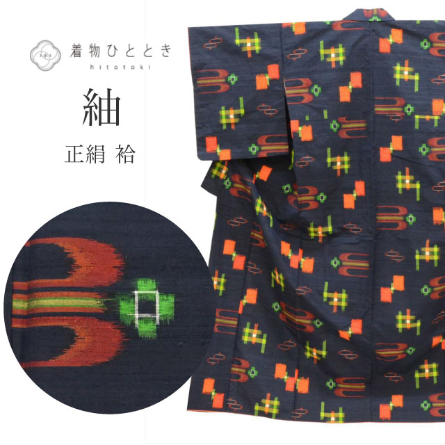 \最大15%OFFクーポン+P5倍/ 【中古】 リサイクル着物 身丈157.3cm 裄丈64cm 真綿紬 正絹 仕立て上がり つむぎ M 紺色系 亀甲絣文様 特品 [ 着物 中古 帯 リサイクル 振袖 浴衣 袴 和服 古着 ] rr1970b 15,400 ~