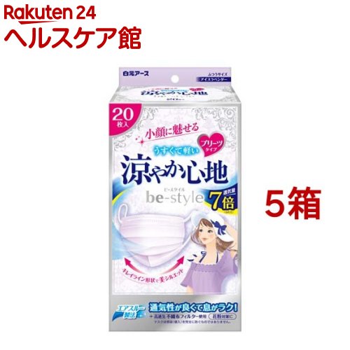 お店TOP>衛生医療>マスク>小さめマスク>女性用マスク>ビースタイル プリーツタイプ 涼やか心地 アイスラベンダー (20枚入×6セット)【ビースタイル プリーツタイプ 涼やか心地 アイスラベンダーの商品詳細】●通気量7倍で息がラク。 (白元アースマスク商品比)ムレにくく、軽やかなつけ心地の口もと素材(エアスルー製法)。 ●小顔魅せポイント1:上から広がるプリーツですっきり・プリーツトップの位置が高いのですっとした鼻筋を演出。 ・プリーツがもたつかないので、すっきりとした横顔に。 ●小顔魅せポイント2:縦プリーツ&引き上げタックで美シルエット・縦プリーツと引き上げタックでシャープなアゴ先に。 ・フェイスラインに沿うことで視覚的な小顔効果を実現。 【使用方法】(1)マスクを袋から1枚ずつ取り出します。 (2)上下の端を軽くつまみ、プリーツを広げてください。 張り出した側が外側になります。 (3)ノーズフィッターを上にして、顔にあてながらひもを両耳にかけます。 (4)ノーズフィッターを鼻の形に合わせて、軽く押さえます。 (5)顔の大きさに合わせてマスクを広げます。 【ビースタイル プリーツタイプ 涼やか心地 アイスラベンダーの原材料】・本体・フィルタ部:ポリプロピレン、ポリエチレン、ポリエステル・耳ひも部:ナイロン、ポリウレタン【規格概要】・サイズ(ふつう):90*165mm(タテ*ヨコ)【注意事項】・本品は有害な粉塵・ガス等を防ぐ目的には使用できません。 ・乳幼児の手の届くところに置かないでください。 ・皮フに異常がある場合や、異常があらわれた場合には使用を中止してください。 ・着用中、臭いで気分が悪くなった場合には使用を中止してください。 ・使い切りタイプですので洗って再使用しないでください。 汚れたら新しいものと交換してください。 衛生面から1日1枚の使用をおすすめします。 ・対象用途以外に使用しないでください。 ★開封後の注意・外箱のふたを閉めて清潔な場所に保管し、早めにご使用ください。 ・一度使用したマスクは、袋内に戻さないでください。 ・使用後は地方自治体の区分に従って捨ててください。 ※蛍光染料は使用していません。 【原産国】中国【ブランド】ビースタイル【発売元、製造元、輸入元又は販売元】白元アース※説明文は単品の内容です。 リニューアルに伴い、パッケージ・内容等予告なく変更する場合がございます。 予めご了承ください。 ・単品JAN:4902407582355白元アース110-0015 東京都台東区東上野2-21-1403-5681-7691広告文責:楽天グループ株式会社電話:050-5577-5043[マスク/ブランド:ビースタイル/] ビースタイル プリーツタイプ 涼やか心地 アイスラベンダー(20枚入×6セット)【ビースタイル】[マスク プリーツ 小顔 女性向け おしゃれ 不織布 夏用] 4,893 ~