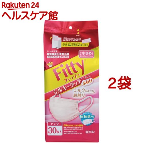 お店TOP>衛生医療>マスク>マスク全部>使い捨てマスク>フィッティ シルキータッチ 耳ゴムふわり ケース付 やや小さめサイズ ピンク (30枚入*2袋セット)【フィッティ シルキータッチ 耳ゴムふわり ケース付 やや小さめサイズ ピンクの商品詳細】●シルクのような肌触り。 ●ノーズフィッターで顔のラインにフィット。 ●立体プリーツ加工で不快な息苦しさを解消。 ●1枚1枚袋入りで持ち運びに便利。 ●3層構造で花粉・ホコリをしっかりガード。 ●耳にやさしい幅広ふわふわゴム。 ●マスク用スタンドケース付き。 【使用方法】(1)表と裏を確認します。 耳かけゴムが接着されている面が外側(顔に触れない面)です。 (2)ノーズフィッターを鼻の形に合わせます。 (3)顔にフィットさせながら、耳かけゴムを掛けます。 (4)顔の大きさに合わせてプリーツを上下に広げます。 【フィッティ シルキータッチ 耳ゴムふわり ケース付 やや小さめサイズ ピンクの原材料】・本体・フィルタ部:ポリプロピレン、ポリエチレン・耳ひも部:ナイロン、ポリエステル、ポリウレタン・ノーズフィッター部:ポリエチレン【規格概要】・サイズ:約14.5cm*9cm・カラー:本体(ピンク)/耳ひも部(白)・対象:風邪・花粉・ほこり等【注意事項】★使用上の注意・本品は有害な粉塵やガス等が発生する場所でのご使用や、それを防ぐ目的には使用できません。 ・肌に異常がある場合や、かゆみ・かぶれ・発疹等の症状があらわれた時は、ただちに使用を中止し医師にご相談ください。 ・においで気分が悪くなった場合には、ご使用を中止してください。 ・マスク上部にノーズフィッターがついてますので、取り扱いにご注意ください。 ・使いきりマスクのため洗濯などによる再使用はできません。 ・火気のそばでのご使用はおやめください。 ・不織布の製造上ごく稀に色ムラが出ることがありますが性能に変わりはありません。 ・個人差等により、メガネが曇る場合がありますので、運転の際などは十分にご注意ください。 ・衛生面・機能面から、1日1枚のご使用をおすすめします。 ・個別包装の印刷が、まれに色移りをおこす場合があります。 ・開封時にはさみを使用される場合は、中身の個別包装まで切らないようご注意ください。 ・使用に際して外装の説明を必ずお読みください。 ・必要な時に読めるよう外装の袋は捨てずに大切に保管してください。 ★保管上の注意・湿気のない清潔な所に保管してください。 ・乳幼児の手の届かないところに保管してください。 【原産国】中国【ブランド】フィッティ【発売元、製造元、輸入元又は販売元】玉川衛材※説明文は単品の内容です。 リニューアルに伴い、パッケージ・内容等予告なく変更する場合がございます。 予めご了承ください。 ・単品JAN:4901957215454玉川衛材東京都千代田区富士見1-8-19住友不動産富士見ビル14階03-4334-8857 広告文責:楽天グループ株式会社電話:050-5577-5043[マスク/ブランド:フィッティ/] フィッティ シルキータッチ 耳ゴムふわり ケース付 やや小さめサイズ ピンク(30枚入*2袋セット)【フィッティ】 1,928 ~