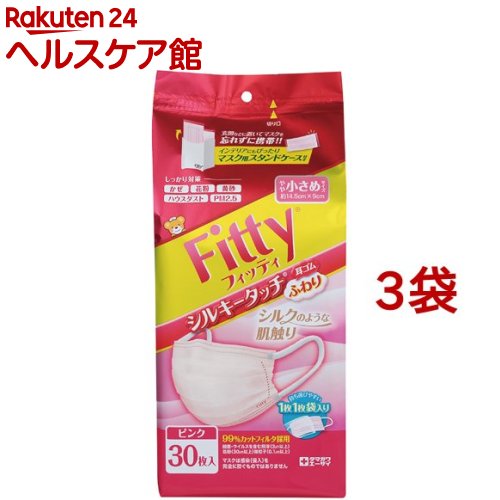 お店TOP>衛生医療>マスク>マスク全部>使い捨てマスク>フィッティ シルキータッチ 耳ゴムふわり ケース付 やや小さめサイズ ピンク (30枚入*3袋セット)【フィッティ シルキータッチ 耳ゴムふわり ケース付 やや小さめサイズ ピンクの商品詳細】●シルクのような肌触り。 ●ノーズフィッターで顔のラインにフィット。 ●立体プリーツ加工で不快な息苦しさを解消。 ●1枚1枚袋入りで持ち運びに便利。 ●3層構造で花粉・ホコリをしっかりガード。 ●耳にやさしい幅広ふわふわゴム。 ●マスク用スタンドケース付き。 【使用方法】(1)表と裏を確認します。 耳かけゴムが接着されている面が外側(顔に触れない面)です。 (2)ノーズフィッターを鼻の形に合わせます。 (3)顔にフィットさせながら、耳かけゴムを掛けます。 (4)顔の大きさに合わせてプリーツを上下に広げます。 【フィッティ シルキータッチ 耳ゴムふわり ケース付 やや小さめサイズ ピンクの原材料】・本体・フィルタ部:ポリプロピレン、ポリエチレン・耳ひも部:ナイロン、ポリエステル、ポリウレタン・ノーズフィッター部:ポリエチレン【規格概要】・サイズ:約14.5cm*9cm・カラー:本体(ピンク)/耳ひも部(白)・対象:風邪・花粉・ほこり等【注意事項】★使用上の注意・本品は有害な粉塵やガス等が発生する場所でのご使用や、それを防ぐ目的には使用できません。 ・肌に異常がある場合や、かゆみ・かぶれ・発疹等の症状があらわれた時は、ただちに使用を中止し医師にご相談ください。 ・においで気分が悪くなった場合には、ご使用を中止してください。 ・マスク上部にノーズフィッターがついてますので、取り扱いにご注意ください。 ・使いきりマスクのため洗濯などによる再使用はできません。 ・火気のそばでのご使用はおやめください。 ・不織布の製造上ごく稀に色ムラが出ることがありますが性能に変わりはありません。 ・個人差等により、メガネが曇る場合がありますので、運転の際などは十分にご注意ください。 ・衛生面・機能面から、1日1枚のご使用をおすすめします。 ・個別包装の印刷が、まれに色移りをおこす場合があります。 ・開封時にはさみを使用される場合は、中身の個別包装まで切らないようご注意ください。 ・使用に際して外装の説明を必ずお読みください。 ・必要な時に読めるよう外装の袋は捨てずに大切に保管してください。 ★保管上の注意・湿気のない清潔な所に保管してください。 ・乳幼児の手の届かないところに保管してください。 【原産国】中国【ブランド】フィッティ【発売元、製造元、輸入元又は販売元】玉川衛材※説明文は単品の内容です。 リニューアルに伴い、パッケージ・内容等予告なく変更する場合がございます。 予めご了承ください。 ・単品JAN:4901957215454玉川衛材東京都千代田区富士見1-8-19住友不動産富士見ビル14階03-4334-8857 広告文責:楽天グループ株式会社電話:050-5577-5043[マスク/ブランド:フィッティ/] フィッティ シルキータッチ 耳ゴムふわり ケース付 やや小さめサイズ ピンク(30枚入*3袋セット)【フィッティ】 2,823 ~