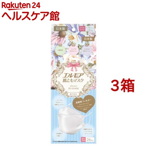 お店TOP>衛生医療>マスク>マスク全部>マスク全部>エルモア 肌ともマスク Flower ホワイト 個別包装 (24枚入*3箱セット)【エルモア 肌ともマスク Flower ホワイト 個別包装の商品詳細】●VFE・PFE・BFE99%カットの高密度フィルター採用。 ●花粉・ウイルス飛まつ・細菌飛まつ・PM2.5等をしっかりガード!●呼吸がしやすく、メイクが付きにくい立体構造。 ●マチが上部と下部に分かれた立体構造で高密着。 美しいフェイスラインを演出し、小顔効果も期待できます。 ●伸縮性のあるソフトゴムの耳ひもと、ノーズ部の山形カットライン&ノーズフィッターで肌によりフィット。 ●便利で衛生的な個別包装パッケージ●日本製【エルモア 肌ともマスク Flower ホワイト 個別包装の原材料】・本体:フィルター(ポリオレフィン)、ノーズフィッター部(ポリオレフィン)、耳ひも部(ポリオレフィン)【規格概要】・マスクサイズ:約20cm*約8cm【注意事項】※マスクは感染を完全に防ぐものではありません。 ・本品は有害ガスや有害粉塵に対しては効果はありません。 ・本品の使用により、かゆみ、かぶれなどの症状が現れた場合は、使用を中止し、医師または薬剤師に相談してください。 ・本品は使いきりタイプです。 洗濯などによる再使用はできません。 一日一枚を目安としたご使用をお勧めします。 ・使用時に不織布特有の臭いが気になったり、息苦しさを感じた場合は、使用を中止してください。 ・本品には、ノーズフィッターが使用されています。 取り扱いには十分注意してください。 ★保管上の注意・直射日光、高温多湿を避け、清潔な場所に保管してください。 ・乳幼児の手の届かない場所に保管してください。 【原産国】日本【ブランド】エルモア【発売元、製造元、輸入元又は販売元】カミ商事※説明文は単品の内容です。 リニューアルに伴い、パッケージ・内容等予告なく変更する場合がございます。 予めご了承ください。 ・単品JAN:4971633910225カミ商事愛媛県四国中央市三島宮川1-2-270896ー24-5316広告文責:楽天グループ株式会社電話:050-5577-5043[マスク/ブランド:エルモア/] エルモア 肌ともマスク Flower ホワイト 個別包装(24枚入*3箱セット)【エルモア】 2,905 ~