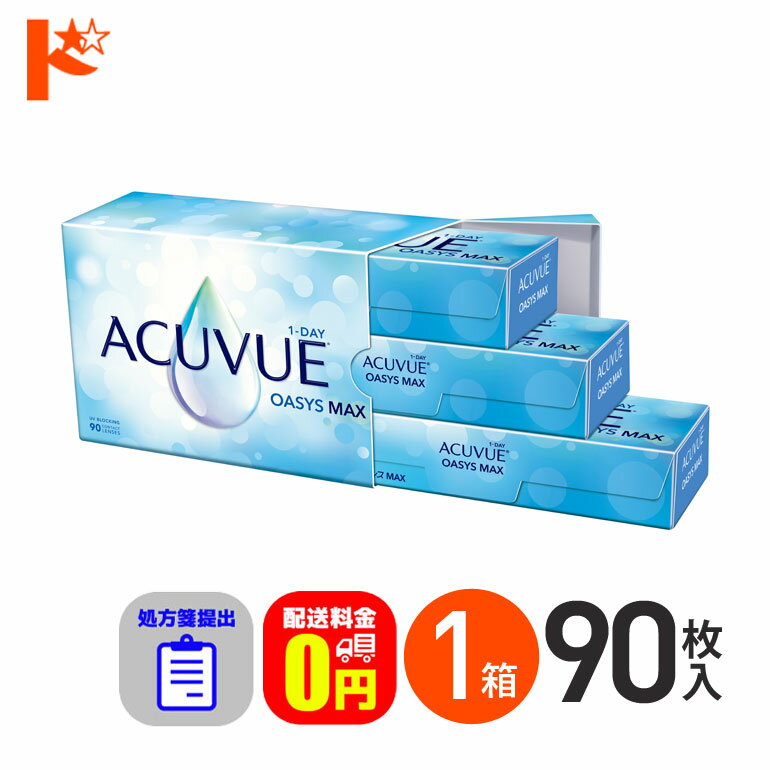 製品情報 製品名 ワンデーアキュビューオアシスMAX 近視・遠視用 90枚パックACUVUE OASYS MAX 1-DAY 内容量 30枚入り×3箱 装用期間 1日 BC(ベースカーブ) 9.0mm / 8.5mm DIA(直径) 14.3mm 含水率 38% 製造国 アメリカ合衆国 又は アイルランド共和国 区分 高度管理医療機器 医療機器承認番号 30400BZX00143000 広告文責 有限会社ブレンステム TEL:06-6455-6110 「高度管理医療機器等販売業許可証」取得(許可番号:第N02704号)※当店では改正薬事法に基づいた法令遵守体制を実践しております。 ご注意事項 コンタクトレンズは高度管理医療機器です。 取り扱い方法を守り正しくご使用ください。 お客様の目の健康と安全を考え、定期検査は必ずお受けくださいますようお願いいたします。 コンタクトレンズ使用による眼のトラブルに関して、弊社は医療上の責任を一切負いません。 ※ご注文内容により、メーカー直送にて発送させていただく場合がございます。 製品に関するお問い合わせ先 販売元 ジョンソン・エンド・ジョンソン株式会社 お問い合わせ窓口 0120-132-308 受付時間:9:00〜17:30(日・祝日を除く)ご購入後に 処方箋の提出 が必要です 処方箋のご提出について 本製品のご購入に際しましては、ご注文完了後に「処方箋のご提出が必要」です。 事前に上のボタンから提出ルールなどをご確認くださいますようお願い申し上げます。 処方箋をお持ちでない場合は、ご購入いただくことができませんので予めご了承ください。 ▼ 30枚パックはこちら 1箱(30枚入)1箱でも4,060円 2箱セット(両眼1ヶ月分)1箱あたり3,880円 4箱セット(両眼2ヶ月分)1箱あたり3,730円 6箱セット(両眼3ヶ月分)1箱あたり3,729円 8箱セット(両眼4ヶ月分)1箱あたり3,728円 ▼ お得な90枚パックはこちら 1箱(90枚入)30枚あたり3,547円 2箱セット(両眼3ヶ月分)30枚あたり3,505円 4箱セット(両眼6ヶ月分)30枚あたり3,377円 6箱セット(両眼9ヶ月分)30枚あたり3,376円 8箱セット(両眼1年分)30枚あたり3,375円 ※上記の価格と実際の販売価格は異なる場合がございます。 各商品ページの販売価格が正しい価格となりますので、上記の価格は参考程度にご利用ください。