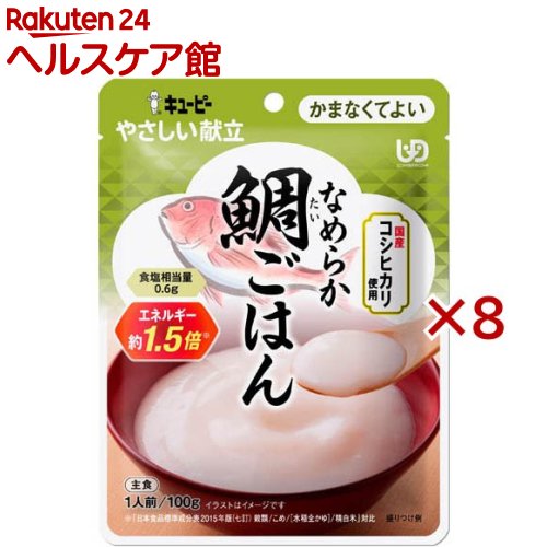 お店TOP>介護>介護食品>介護食>主食(介護食)>キユーピー やさしい献立 なめらか鯛ごはん (100g×8セット)【キユーピー やさしい献立 なめらか鯛ごはんの商品詳細】●鯛めしをイメージし、鯛と鯛だしをお米と一緒に炊きあげて、なめらかに裏ごししました。食べやすくまとまりがあり、一般的なおかゆの約1.5倍※のエネルギーがとれる仕立てになっています。※「日本食品標準成分表2015年版 穀類/こめ/水稲全かゆ/精白米」対比【品名・名称】米飯類【キユーピー やさしい献立 なめらか鯛ごはんの原材料】米(国産)、植物油脂、たい、たいだし、しょうゆ、食塩、米発酵調味料、かつお節エキス、油揚げ、かつお風味調味料/乳化剤、ゲル化剤(増粘多糖類)、調味料(アミノ酸等)、乳酸カルシウム、酸化防止剤(ビタミンC)、(一部に小麦・さば・大豆を含む)【栄養成分】1袋(100g)当たりエネルギー111Kcal、たんぱく質1.3g、脂質6.6g、炭水化物11.5g、食塩相当量0.6g【アレルギー物質】小麦・さば・大豆【保存方法】直射日光を避け、常温で保存してください。【注意事項】・温めた後は袋及び中身が大変熱くなります。また、中身がはねる場合がありますので、ヤケドにご注意ください。・ヤケドをしないように温度を確かめてから召しあがってください。・食事介助が必要な方にご利用の際は、飲み込むまで様子を見守ってください。【原産国】日本【発売元、製造元、輸入元又は販売元】キユーピー※説明文は単品の内容です。リニューアルに伴い、パッケージ・内容等予告なく変更する場合がございます。予めご了承ください。・単品JAN:4901577033315キユーピー182-0002 東京都調布市仙川町2-5(お客様相談室)0120-14-1122広告文責:楽天グループ株式会社電話:050-5577-5043[介護食] キユーピー やさしい献立 なめらか鯛ごはん(100g×8セット) 1,872 ~