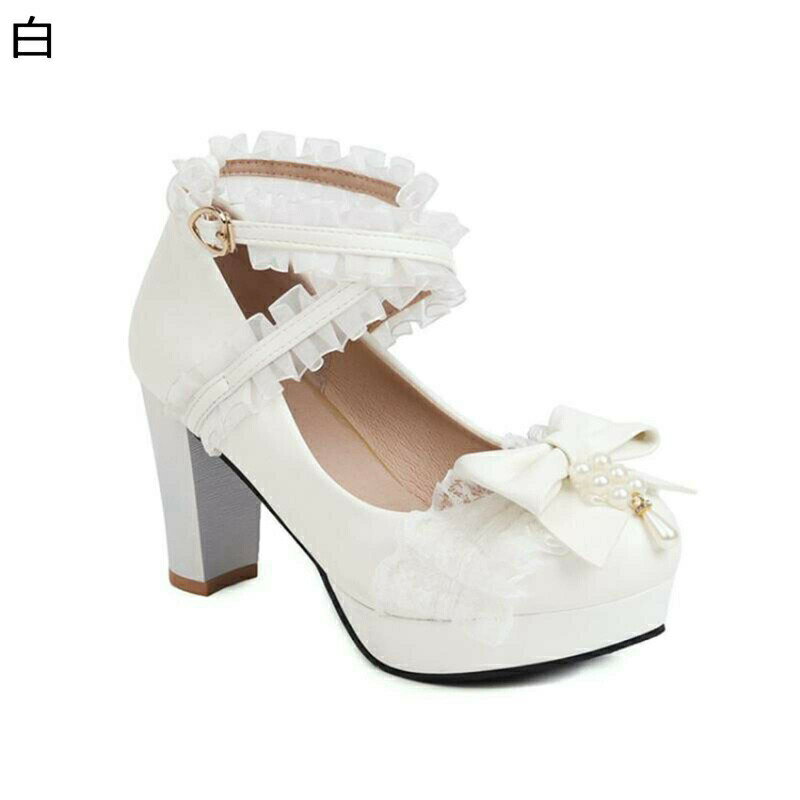ロリータ靴 19.0-29.0cm パンプス ハイヒール レディース フリル レース 蝶結び リボン コスプレ靴 ドレスシューズ 大きいサイズ クロスストラップ 粗いかかと ファッション カジュアル 7,458 ~
