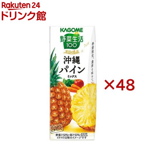 お店TOP>水・飲料>野菜ジュース・フルーツジュース>フルーツジュース・果実ジュース>フルーツ・野菜ジュース>野菜生活 本日の逸品 沖縄 パインミックス (24本入×2セット(1本195ml))【野菜生活 本日の逸品 沖縄 パインミックスの商品詳細】●沖縄の太陽の光をたっぷり受け、甘味と酸味のバランスが良い沖縄県産パインの味わいに仕上げた野菜&果実100%ミックスジュースです。 ●果実のピューレーを使った濃厚な味わいに仕上げました。 ●たっぷりビタミンCおやつ・デザートタイムやリラックスシーンにおすすめです。 【品名・名称】野菜・果実ミックスジュース【野菜生活 本日の逸品 沖縄 パインミックスの原材料】野菜(にんじん(輸入)、小松菜、ケール、ブロッコリー、ピーマン、ほうれん草、アスパラガス、赤じそ、だいこん、はくさい、セロリ、メキャベツ(プチヴェール)、紫キャベツ、ビート、たまねぎ、レタス、キャベツ、パセリ、クレソン、かぼちゃ)、果実(りんご、レモン、パインアップル(沖縄県産100%)、バナナ)/香料、ビタミンC、クエン酸【栄養成分】1本/195ml当たりエネルギー:87kcal、たんぱく質:0.6g、脂質:0g、炭水化物:21.8g(糖質:20.7g、糖類:17.9g、食物繊維:0.7-1.4g)、ナトリウム:14-82mg(食塩相当量:0.03-0.3g)、カリウム:210-450mg、カルシウム:10-23mg、ビタミンC:43-180mg、ビタミンK:0-5μg、葉酸:0-17μg【アレルギー物質】バナナ、りんご【保存方法】直射日光や高温多湿を避けて保存してください。 【原産国】日本【ブランド】野菜生活100 紙【発売元、製造元、輸入元又は販売元】カゴメ本品はメーカー製造中止のため、在庫限りで販売終了となります。 ※説明文は単品の内容です。 リニューアルに伴い、パッケージ・内容等予告なく変更する場合がございます。 予めご了承ください。 ・単品JAN:4901306300190カゴメ103-8461 東京都中央区日本橋浜町三丁目21番1号 日本橋浜町Fタワー0120-401-831広告文責:楽天グループ株式会社電話:050-5577-5043[野菜ジュース・フルーツジュース/ブランド:野菜生活100 紙/] 野菜生活 本日の逸品 沖縄 パインミックス(24本入×2セット(1本195ml))【野菜生活100 紙】 7,545 ~