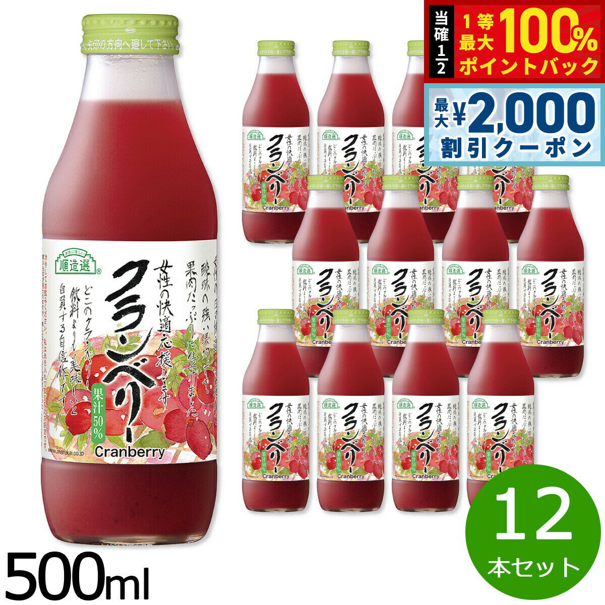 【抽選で最大10000ptバック!お買物マラソン限定!】順造選 クランベリー 500ml×12本セット ジュース ストレート 果汁50 無添加 無香料 瓶 日本製 粗搾り 果肉入り 【送料無料】 9,072 ~