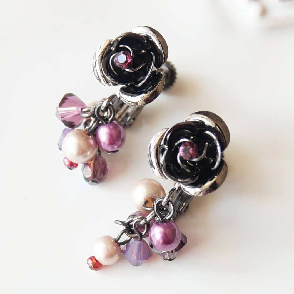 【tearsheaven オリジナル ハンドメイド】 紫のストーンが中央の薔薇イヤリング パール、ガラス、ビーズが揺れるシャワータイプ パープル、スモークパープルのスワロフスキーを使用 ガンメタ仕上げでワインカラー系のスタイルにマッチする ローズシリーズのNEWアイテムです。 【サイズ】 全長 縦:約2.7センチ 【材質】 メタル、ガラス、ビーズ、合成樹脂日本製 【ローズガーデン】薔薇 パール パープル ビーズ イヤリング 4,180 ~