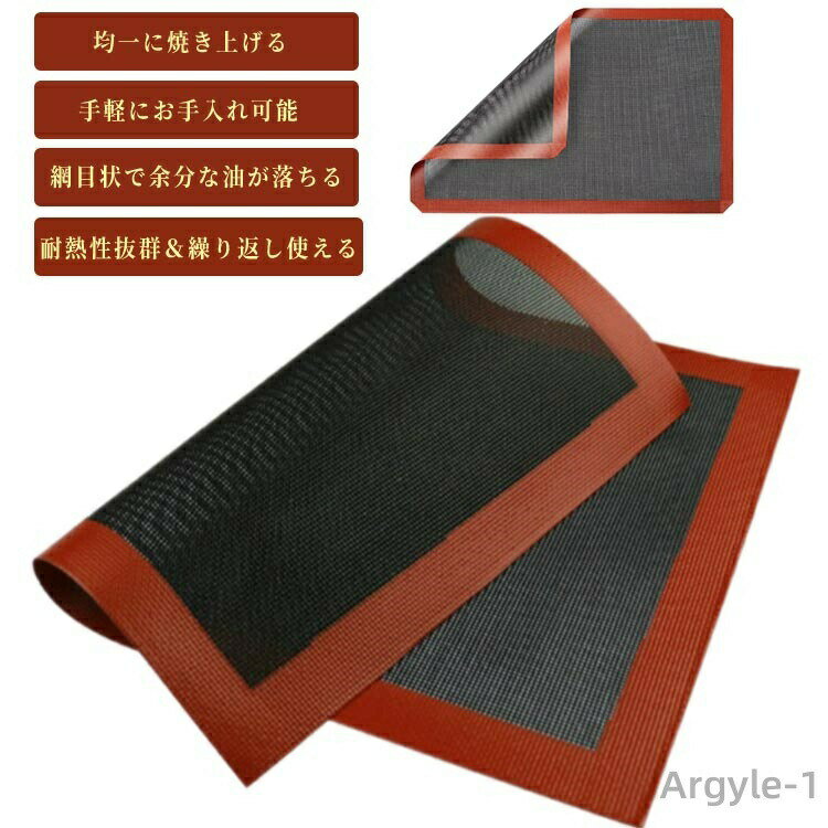 【耐熱性抜群&繰り返し使える】グラスファイバーにシリコン加工がされたベーキングマットです。 ムラなく均等に焼けるのが特徴で、-40℃か230℃までの耐寒耐熱性があります。 耐久性も抜群で半永久的にご使用いただけます。 オーブンペーパーよりも経済的です!【均一に焼き上げる】網目状の加工を施されるため、シルパンを敷くと、火の通り具合が均一になります。 シルパンにより、凸凹のない均一な断面と網目の跡が付き、焼き色が均一な底面を焼き上げます。 【網目状で余分な油が落ちる】シルパンを使って焼くと網目状の加工により、余分な油脂や水分が抜けサクサクに焼けると同時に生地が浮くことなく、滑らかな焼き上がりになります。 より健康、より美味しいクッキーが楽しめます。 【手軽にお手入れ可能】表面が滑らかなゴム素材で出来ているため、焼く前に天板やパットに油を塗らなくても綺麗にお菓子を焼き上げることができます。 お菓子作りを楽しみながら、余計な脂肪分の摂取は抑えられます。 【滑り止め】オーブンペーパーは薄いので天板の上に敷いても滑ってしまったり、クルっと丸まってしまってうまく敷くことができないこともありますよね。 【デザインにこだわる優れ物】表面がメッシュのようなデザインなので、通気性抜群で余分な油や水分が落ち、熱が均一に伝わりやすいです。 綺麗にお菓子を焼けます。 【柔らかく収納に便利】シリコン製で柔軟性が高いため、使用しない時にはクルっと巻いて簡単に収納できる大変便利なアイテムです。 【幅広い用途】オーブンペーパーに代わる調理道具として、お菓子を焼くことができるだけでなく、また鶏肉や魚のオーブン焼きマットとしても活躍します。 サイズ 30×40cm(2枚入り) サイズについての説明 サイズ:30×40cm 厚さ約0.65-0.7mm耐熱温度:-40°C〜230°C※サイズ計測には誤差が生じます。 素材 グラスファイバー シリコン 色 赤黒直角 赤黒カット角 備考 ●サイズ詳細等の測り方はスタッフ間で統一、徹底はしておりますが、実寸は商品によって若干の誤差(1cm〜3cm )がある場合がございますので、予めご了承ください。 ●製造ロットにより、細部形状の違いや、同色でも色味に多少の誤差が生じます。 ●パッケージは改良のため予告なく仕様を変更する場合があります。 ▼商品の色は、撮影時の光や、お客様のモニターの色具合などにより、実際の商品と異なる場合がございます。 あらかじめ、ご了承ください。 ▼生地の特性上、やや匂いが強く感じられるものもございます。 数日のご使用や陰干しなどで気になる匂いはほとんど感じられなくなります。 ▼同じ商品でも生産時期により形やサイズ、カラーに多少の誤差が生じる場合もございます。 ▼他店舗でも在庫を共有して販売をしている為、受注後欠品となる場合もございます。 予め、ご了承お願い申し上げます。 ▼出荷前に全て検品を行っておりますが、万が一商品に不具合があった場合は、お問い合わせフォームまたはメールよりご連絡頂けます様お願い申し上げます。 速やかに対応致しますのでご安心ください。