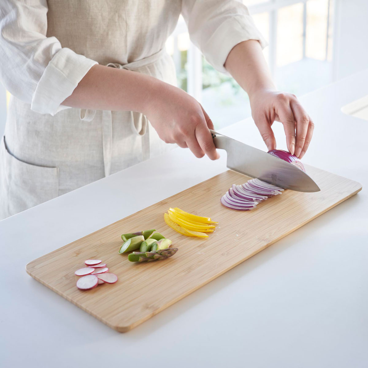 使いやすい大きめ、ロングサイズ! tosca まな板 ロングは、食材を一度に切ることができる大きめサイズの竹製まな板です。 刻んだ食材を端によけられるので、色々な食材を一度に切ることができます。 シンクに渡して食材の一時置きにも便利です。 柔らかな刃当たりは包丁を長持ち! 竹の柔らかな刃当たりは包丁を長持ちさせます。 また、プレートとして、切った食材をそのまま食卓に並べることができます。 側面のカッティングで持ちやすく、裏面も使えるので、多彩な料理に最適です。 商品の情報 ・ブランド:YAMAZAKI(山崎実業)/日本 ・ジャンル:まな板 ・主な素材:竹 ウレタン塗装 ・生産国:中国 ・サイズ:約W450xD168xH10mm(本体)/約W435xD155mm(裏カット面) ・重量:約580g ・耐熱温度:120℃ ・耐冷温度:-40℃ ・対応サイズ:幅約40cm以内のシンク ・注意事項:食器洗い乾燥機には対応しておりません。 漂白剤は使用不可。 ・その他:刻印のある面が裏面です。
