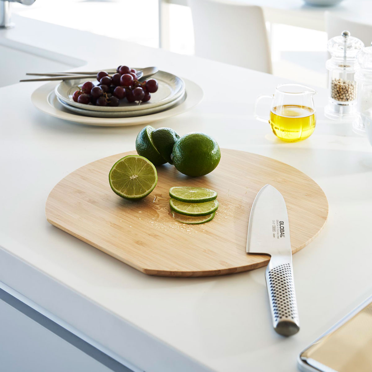 刃当たりがやわらかく包丁にやさしい竹製! 食材を一度に切ることができる、竹製の丸いまな板。 刻んだ食材を乗せたまま、まな板を広く使えて色々な食材を一度に切ることができます。 刃当たりがやわらかいので包丁も長持ち。 側面のカッティングで持ちやすい形状になっています。 持ち上げしやすい側面のカッティング! プレートとして、切った食材をそのまま食卓に並べることができます。 奥行きがあり広く使える丸型のまな板。 色々な食材を一度にカットできます。 toscaの刻印のある方が裏面ですが、表面、裏面の両方を使用できます。 商品の情報 ・ブランド:YAMAZAKI(山崎実業)/日本 ・ジャンル:まな板 ・主な素材:竹 ウレタン塗装 ・生産国:中国 ・サイズ:約W300XD280XH10mm/約W285xD260mm(裏カット面) ・重量:約530g ・耐熱温度:120℃ ・耐冷温度:-40℃ ・注意事項:食器洗い乾燥機には対応しておりません。 漂白剤は使用不可。 ・その他:刻印のある面が裏面です。