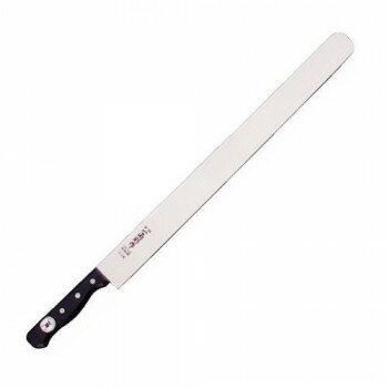 ※パッケージ、デザイン等は予告なく変更される場合があります。 ※画像はイメージです。 商品タイトルと一致しない場合があります。 ステンレスモリブデン鋼材(8A)使用のカステラナイフです。 切断能力は直刃タイプより高くなっています。 柄は黒合板(強化積層木材)を使用し、固くて丈夫な木製柄です。 カステラなどのスポンジ状の長い物を切るのに大変便利です。 カステラ等は牛刀などでも切れますが、切断面に切り返しの段がつきやすいです。 その点、この刀身が細長いカステラナイフを使えば切断面が綺麗になります。 使用方法としては、まず食材に刃を当て前に押して刃が食材に入ったら、ノコギリのように前後して切ります。 鋭い波刃が食材に食い込んでゆくのが解ります。 切断する物より大きめのサイズをお選び下さい。 刃にステンレスを使用したのは訳があります。 カステラ等のお菓子類には糖分、塩分、アルコ-ル、油分など金属を酸化(サビ)させる成分が多く含まれています。 これらに対応すべく錆びにくく切れ味を確保したステンレスモリブデン鋼を使用しました。 さらに使用した後は、刀身にお湯または水をかけ、フキン等でさっと拭いていただくだけでOKです。 このメンテナンスの気楽さはステンレスならではです。 使用用途としてカステラやケ-キ等にはもちろん、切断面に切り返しの段がつきにくいので、大きな食材のスライスも向いています。 業務用カステラナイフとしてケ-キ職人にも人気の包丁です。 ※この包丁は片刃ですので右利き専用となっております。 ※モニターの発色の具合によって実際のものと色が異なる場合があります。 サイズ全長:530mm、刃渡り:400mm個装サイズ:56×6×3cm重量205g個装重量:310g素材・材質刃部:ステンレスモリブデン鋼/ 8A柄部:黒合板/強化積層木生産国日本広告文責:株式会社ホームセンターセブンTEL:0978-33-2811※パッケージ、デザイン等は予告なく変更される場合があります。 ※画像はイメージです。 商品タイトルと一致しない場合があります。 fk094igrjs 清水刃物 一角別作 黒合板カステラナイフ ケーキナイフ 波刃 お菓子作り 日本製 400mm 100-400W【メーカー直送:代金引換不可:同梱不可】【北海道・沖縄・離島は配達不可】 15,644 ~