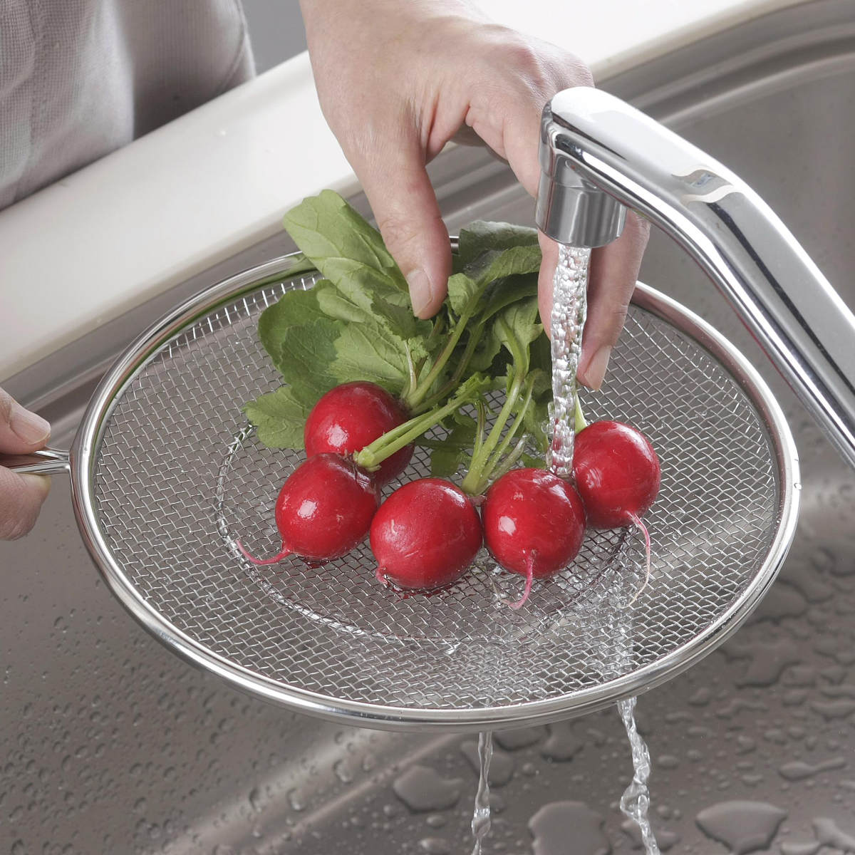 サイズ約 幅21×奥行27.3×高さ2.3(cm)アミ:4メッシュ内容量1個材質18-8ステンレス生産国日本製区分返品・キャンセル区分(小型商品)ギフトラッピングページを見る●平らな形状で食材を重ねずのせられるので、水切れがよくなります。 ●蒸気がこもらないので粗熱が早く取れ、水っぽくなりにくいです。 ●湯切りや揚げ物の油抜き、魚の湯通し、食材の一時置きなど様々な場面で活躍します。 ●大きいアミ目でしっかり水気が切れます。 ●ステンレス製なので錆びにくく、お手入れ簡単で永くお使いいただけます。 ●持ち手をフックにかけて吊り下げ収納も可能です。 おすすめポイント油&水切りがらくらくできる茹でた野菜の粗熱取り、魚の湯通しや揚げ物の油抜きなど、使い勝手バツグンの盆ザルです。 平らな形状は食材を広げて並べることができ、空気に触れる面積が広くなるので水切れがよく、早く冷ますことができます。 商品詳細丈夫で錆びにくいステンレス製ステンレス製なので錆びにくく、お手入れが簡単です。 また、耐久性にも優れているので永くお使いいただけます。 調理後はそのままテーブルへ冷水でしめた麺を盛り付けたり、お鍋の材料をのせたりと、食卓でも活躍してくれます。 シリーズ紹介フライパンザルフライパンザル 深型20cmフライパンザル 深型24cm油&水切れザル盆ザル関連キーワード:お手入れ簡単 洗いやすい 茹で分け 湯切りザル 調理用ザル 調理用ざる 取っ手 取っ手付き ハンドル 台所用品 調理用品 調理雑貨 キッチン雑貨 調理小物 キッチン小物 キッチンツール おすすめ 便利 役立つ キッチン便利グッズ 便利グッズ 揚げ物 油抜き 麺 そば 蕎麦 吊り下げ収納 LH1520 関連商品はこちらザル ママクック 手付き 油&水切れ らくらく2,200円ストレーナー 油切りストレーナー ママクック 1,210円油切り すくい油きり 天ぷら名人 998円揚げザル ステンレス製 生活のかたち ステンレ1,280円油切り ミニ揚げ鍋油きりざる 天ぷら名人 1,180円角ザル スタッキングミニ角ざる 3個組 ステン3,300円ストレーナー 16cm ジャストにフィット ス1,580円ストレーナー 20cm ジャストにフィット ス1,780円ストレーナー 18cm ジャストにフィット ス1,580円ストレーナー 14cm ジャストにフィット ス1,480円ストレーナー 12cm ジャストにフィット ス1,280円ザル 21cm ステンレスザル 逸品物創 ステ1,980円 盆ザル 21cm ママクック 手付き ステンレス製 日本製 ( Mamacook ざる 水切りザル 油切りザル 油切り カス揚げ 湯切りざる 水切りざる キッチンザル ステンレス製ざる ステンレス製ザル 調理器具 ステンレス ストレーナー )【39ショップ】 1,980 ~