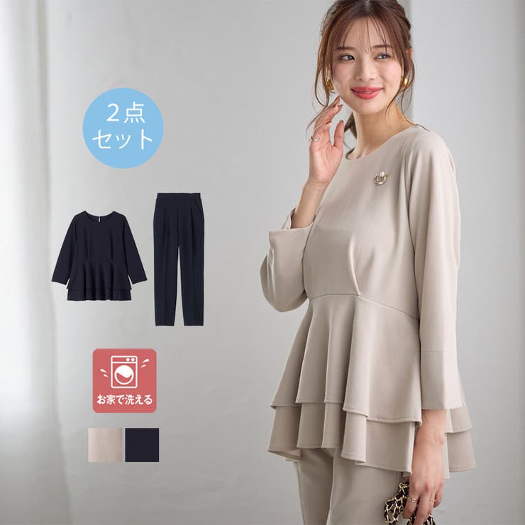 上品な華やかさが魅力的。 ペプラムティアードブラウスセットアップ【ペプラムティアードブラウス】+【テーパードパンツ】の2点セット〇女性らしい”ペプラム×ティアード”のデザインが華やかなセットアップ〇シンプルなデザインだから、合わせる小物次第でオケージョンからオフィスシーンまで活躍〇伸縮性のあるカットジョーゼット素材で着心地も◎-おすすめシーン-入園・入学式、卒園・卒業式、七五三、お呼ばれ、学校行事、同窓会、謝恩会、成人式、セレモニー、フォーマル、オフィスカジュアル、結婚式■デザイン〈ブラウス〉きちんと感と華やかさを両立する、ペプラム×ティアードデザインのブラウス。 少し高めのウエスト切替&上品に広がるペプラムシルエットが、大人っぽくスタイルアップを演出。 程よくゆとりのあるサイズ感でボディラインを拾いにくいから、楽な着心地でおしゃれ見えが叶います。 〈パンツ〉すっきりと美脚魅せを叶えるテーパードパンツ。 フロントタック&センタープレス入りで脚をすらっときれいに見せれくれるのも嬉しいポイント。 ウエストは後ろゴム入りではき心地も◎■素材上品な生地感のカットジョーゼット素材。 伸縮性のある生地で着心地の良さときちんと見えを両立◎……………………透け感:なし厚さ:普通伸縮性:あり裏地:なし洗濯方法:洗濯機……………………■ 品質/ポリエスエル98%、ポリウレタン2%(ブラウス)■ サイズ(cm)/約M:バスト97、肩幅37、前身丈62、袖丈48L:バスト103、肩幅38.5、前身丈63、袖丈49LL:バスト109、肩幅40、前身丈65、袖丈49●着丈前後差約3.5●裏地無●袖口スリット(7cm)●7分袖(パンツ)■ サイズ(cm)/約M:ウエスト66、ヒップ98、股上29、わたり幅31.3、裾幅16L:ウエスト72、ヒップ104、股上30、わたり幅33.3、裾幅17LL:ウエスト78、ヒップ110、股上31、わたり幅35.3、裾幅18*股下M65、L66、LL67●ウエストゴム入り●ポケット有■ 取扱い/洗濯機---------------------------------------------------------------------------------※サイズ寸法は実際の寸法と多少の誤差がある場合がございます。 ※ご覧いただいているPC/WEB環境や撮影環境により、 多少色味が異なって見える場合がございます。 【お買物をよりお楽しみいただく為に】▼商品のお気に入り登録をおすすめします♪『?をクリック!』完売カラーの再入荷などの通知を受ける事ができます。 ブランドのお気に入り登録もご一緒にお願いいたします。 ---------------------------------------------------------------------------------208961セレモニー セレモニースーツ フォーマルスーツ 2点セット セットアップ 春 春服 卒業式 卒園式 入学式 入園式 入社式 卒入 入卒 10代 20代 30代 40代 50代 60代 オケージョン 冠婚葬祭 通勤 通学 フォーマル オフィスカジュアル レディース オフィス スーツ パンツスーツ ブラックフォーマル ママスーツ リクルート リクルートスーツ 仕事 仕事用 七五三 秋 秋服 体型カバー 体系カバー返品・交換について購入後の交換は受け付けておりません。 予めご了承ください。 返品を希望される場合は購入履歴一覧の「ショップへの問い合わせ」よりお問い合わせください。 =========================複数配送先指定について1件の注文に対して、異なる住所への配送は対応出来かねます。 恐れ入りますが、異なる住所へ配送をご希望の場合、配送先毎に分けて注文いただきますようお願い申し上げます。 【スーツ・フォーマルウェアWOMEN】ネイビー グレージュ M L LLネイビー グレージュ 【10%OFFクーポン!1/29(木)1:59まで】GeeRA 【2点セット】ペプラムティアードブラウスセットアップ スーツ 5,599 ~