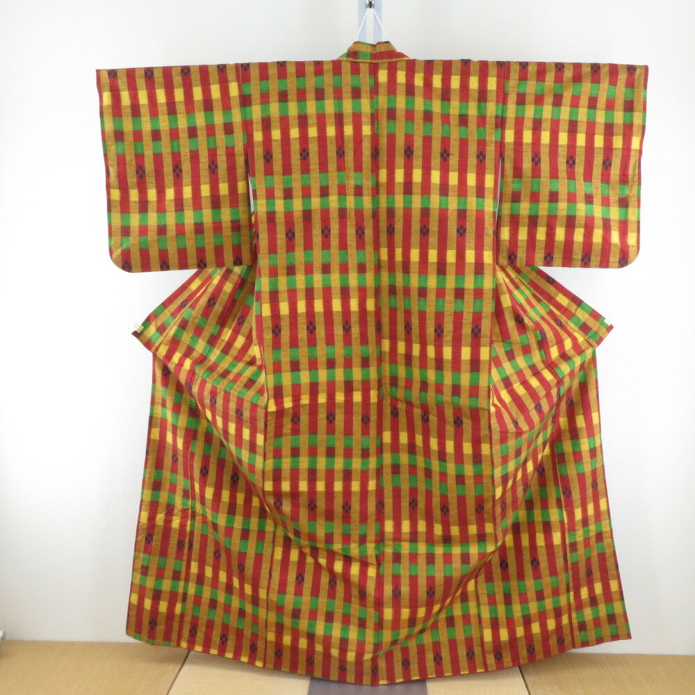紬 着物 袷 正絹 辛子色xエンジ色x緑色 市松に絣模様 バチ衿 カジュアルきもの 普段着物 仕立て上がり 身丈159cm【中古】 4,265 ~