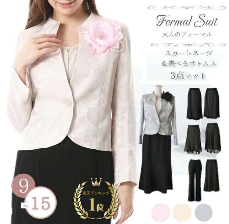 お買い物マラソン ママ スーツ 3点セット フォーマルスーツ 3点組スーツ ボトムが2枚選べる テーラードジャケット ロングスカート パンツ プリーツスカート ママ 母親 ミセス 祖母 結婚式 披露宴 卒業式 入学式 お宮参り 顔合せ 服装 洋服 (ambt2u) 11,990 ~