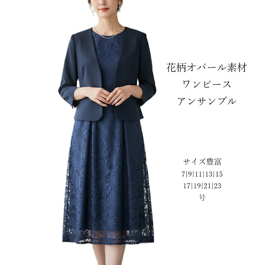 【ワンピース スーツ 2点 セットスーツ ママスーツ 大きいサイズ 小さいサイズ 七五三 同窓会 二次会 謝恩会 卒業式 入学式 スリーシーズン 春スーツ 夏スーツ 秋スーツ 七分袖 半袖ワンピース】 7号、9号、11号、13号、15号、17号、19号サイズのジャケット・ワンピースのアンサンブルスーツです。 軽い着心地で春から秋にかけてお召しいただけます。 デニム調のインディゴ素材を使用で薄手生地です。 ジャケットは首元1つボタンと4つ比翼ボタン。 七分袖、肩パット入り、袖口スリット入りなので気分に合わせて折り返しても素敵です! 首回りレースでメリハリ感とスッキリ感があります。 若干のストレッチ性ありますので、着やせ効果抜群です! 裾ティアードフリルがかわいらしさをプラス。 半袖ワンピースは上身頃レースをあしらっておりますので、とても上品な仕上がりです。 下身頃はジャケットと同素材。 裏地付きですが、袖部分は裏地がありません。 後ろファスナー開きです。 ファッション ウィンザーヒロは、20代・30代・40代・50代・60代・70代・80代以上の幅広い年代の女性を対象としたフォーマルスーツ・ワンピース・コート・事務服などのレディースファッション店です。 小さいサイズ 大きいサイズ SS S M L LL 3L 4L 5L 6L 7L 3号 5号 7号 9号 11号 13号 15号 17号 19号 21号 / 母 ママ ミセス ハイミセス 祖母 母親 叔母 レディース / フォーマルスーツ ブラックフォーマル スーツ ママスーツ 母スーツ カラーフォーマル ハイグレードスーツ ワンピーススーツ スカートスーツ パンツスーツ セットアップ 喪服 礼服 セレモニースーツ アンサンブルスーツ 結婚式スーツ パーティドレス フォーマルドレス フォーマルワンピース ロングスカート シャンタン ベルベット ジャケット セットアップスカート セットアップパンツ セットアップワンピース ボレロ コサージュ コンパニオンスーツ OLスーツ 母親スーツ 入学式スーツ 入園式スーツ 卒業式スーツ 卒園式スーツ お受験スーツ 結婚式スーツ 授業参観スーツ 結婚式 披露宴 記念写真 同窓会 クラス会 謝恩会 卒業式 卒園式 入学式 入園式 発表会 表彰式 セレモニー 七五三 お宮参り お呼ばれ 授業参観 お受験 顔合わせ 春夏秋冬 お買い得スーツ 小さいスーツ 大きいスーツ 上品スーツ 上質スーツ セレブスーツ お宮参りスーツ 七五三スーツ 限 定スーツ 発表会スーツ イベント コスプレ リクルートスーツ 冠婚葬祭 就活スーツ セレモニースーツ 仕事スーツ 入学式スーツ 母 入園式スーツ 卒業式スーツ母 卒園式用スーツ 卒業式用スーツ 入学式用スーツ 入園式用スーツ 卒園式の服装 入園式の服装 卒業式の服装 入学式の服装 売れてるスーツ 人気のスーツ ロング丈 スカート 選べるサイズ 選べるスカート 日本製素材 百貨店 百貨店品質 高級 特価スーツ 当日発送スーツ 即日発送スーツ 本日発送スーツ 最短スーツ 明日着スーツ 当日発送 即日発送 即日配達 本日発送 楽天最安値に挑戦 最短翌日到着 激安 送料無料 あす楽 /サイズ限定品など小さいサイズから大きいサイズの新作 新品 服装 衣装を激安低価格で販売しています。 /即日発送 即納 早い 安心 丁寧 安い急ぎ対応、即日発送、当日発送、迅速発送を心がけています。 ファッション ウィンザーヒロ gekkouusagishop gekkouusagishop 酷暑 猛暑 残暑 対策 涼しい 服 服装 夏用スーツ 秋用スーツ 入学式 スーツ 小柄 小柄さん向け 低身長 細い土 日 祝 毎日 即日 発送 即納 母の日 敬老の日【月間優良ショップ受賞!(2026年1月度)】お急ぎの方必見♪ ファッションウィンザーヒロ は 【迅速・信頼・安心】 最強翌日配送 ラベル認定 即日発送 明日着く 土曜日 日曜日 祝日 土日祝 年中無休 毎日 即納 急ぎ 即日 発送 致します 品質表示 素材 ジャケット 本体   ポリエステル96%  ポリウレタン4% レース部分   ナイロン60%  レーヨン40% ワンピース 上身頃   外側  ナイロン60%  レーヨン40% 内側   スカート部分 ポリエステル96%  ポリウレタン4% 裏地   ポリエステル100% HOTワード: マザースーツ ママスーツ 入学式 入園式 卒園式 卒業式 お宮参り 七五三 結婚式 パーティー 謝恩会 通勤 服装 ママ 母親 スーツ ドレス レディース ジャケット ワンピース スカート オールインワン セットアップ 2点セット 3点セット 大きいサイズ 小さいサイズ フォーマル セレモニー ホワイト ネイビー ブラック ピンク 学校行事 授業参観 セットアップ サイズ豊富 春 夏 秋 冬 13号 15号 L XL 2L XXL マタニティ コーディネート シフォン素材 ツイード素材 ストレッチ素材 スキニー デニム おしゃれ ワンピース スーツ ママスーツ 七五三 お宮参り 顔合わせ 食事会 入学式 学校行事 授業参観 同窓会 謝恩会 ストレッチ素材 デニム調 アンサンブル スリーシーズン 七分袖 半袖ワンピース 小さい 7号 9号 11号 13号 15号 17号 19号 大きい サイズ 体型カバー 8,778 ~